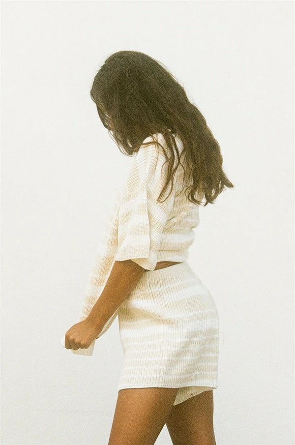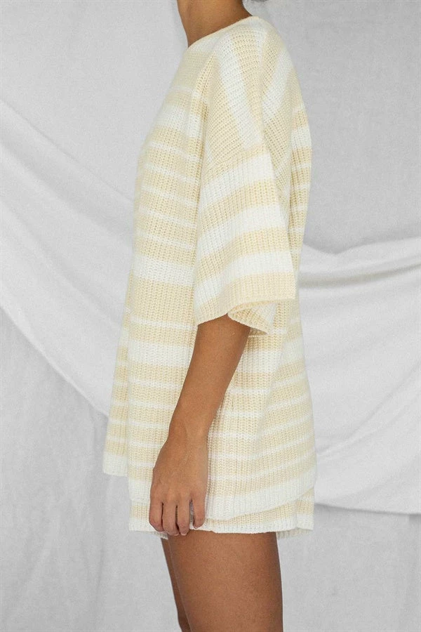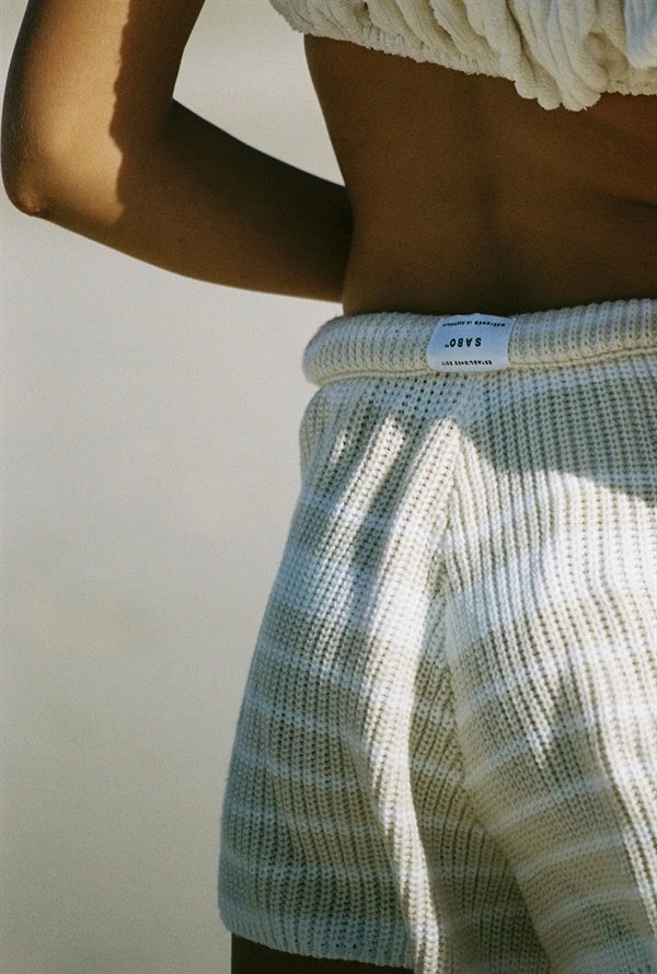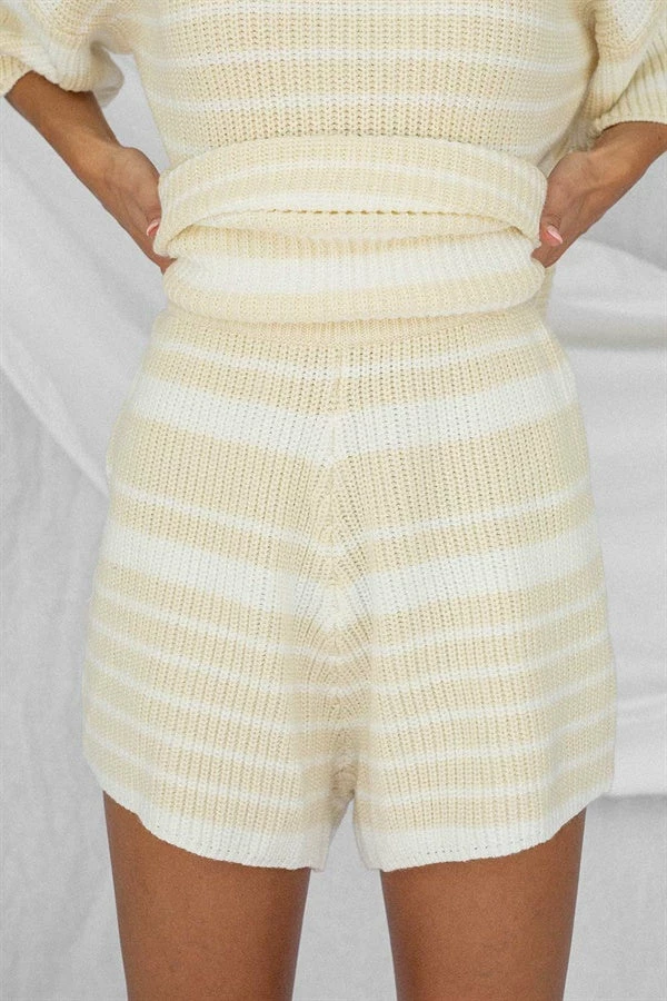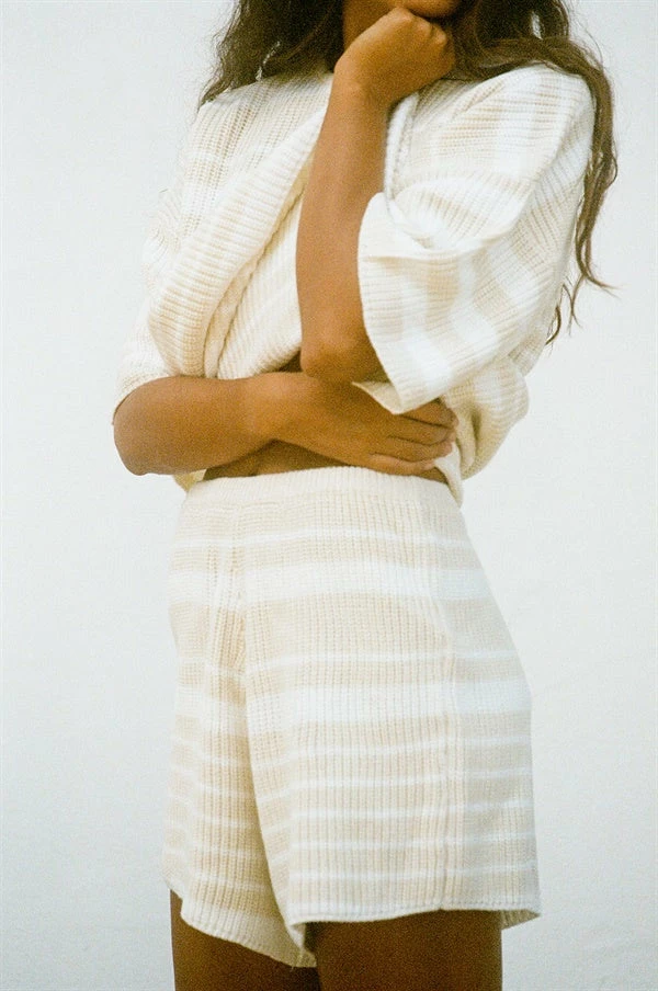 *THIS IS A FINAL SALE ITEM* A staple go-to basic for every wardrobe! The Adelaide Knit Shorts are made from a soft ribbed fabric with off white and beige stripes throughout. They are a high waisted style featuring an elasticated waist and high-low hems. Pair with the Adelaide Knit Top and Weave Handle Tote Bag for a cute weekend look! Exclusively designed by Sabo.