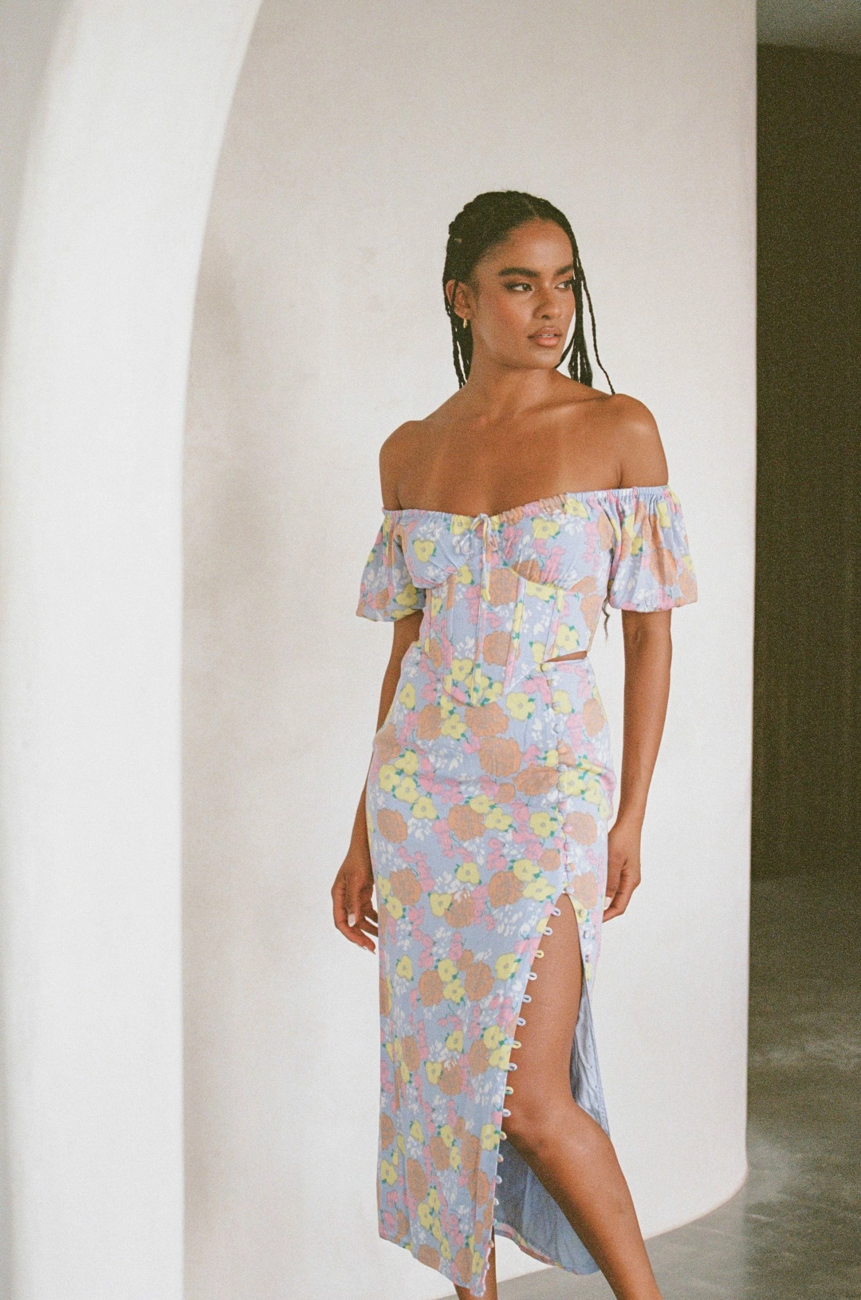 With lines and boning to contour and flatter, the Akia Corset Top is made from a luxurious viscose slub fabric with our exclusive Bryony Fiesta print. It features off shoulder puff sleeves, tie detail at centre bust, boned corseted waist and curved hemline. Get the look with the Akia Midi Skirt! Designed exclusively by Sabo.