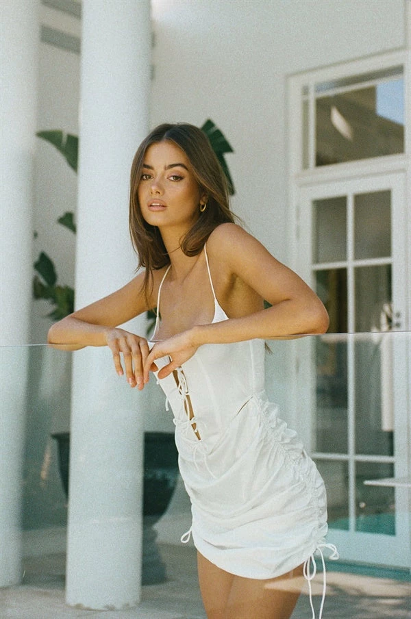 The perfect LWD for a party! The Alira Corset Dress is made from a matte silky fabric in an off white hue. It is a mini style featuring boning at bodice, cutout with ties and a gathered skirt with drawstrings at sides. Pair with the Strappy Eva Heels and T Bar Necklace. Exclusively designed by Sabo.
