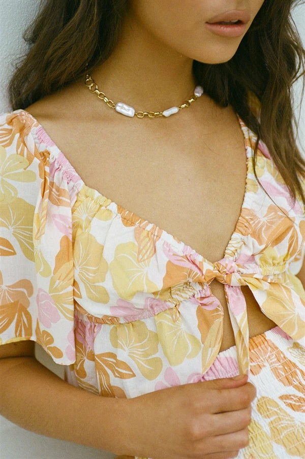 Wear it as a set or pair it with jeans! The Allura Top is made from a high quality natural cotton voile fabric with our exclusive leaf floral print throughout. It is a cropped style featuring bold flared sleeves, an elasticated neckline, tie closure at centre bust and an asymmetric frill across hem. Designed exclusively by Sabo.