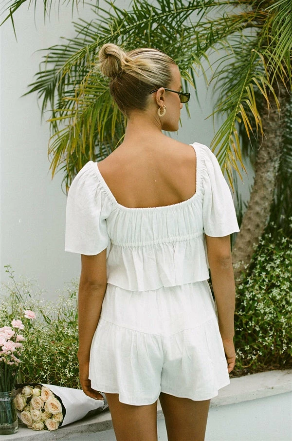 Wear it as a set or pair it with jeans! The Allura Top is made from a raw linen blend fabric in a light cream hue. It is a cropped style featuring flared short sleeves, an elasticated neckline, tie closure at centre bust and an asymmetric frill across hem. Designed exclusively by Sabo.