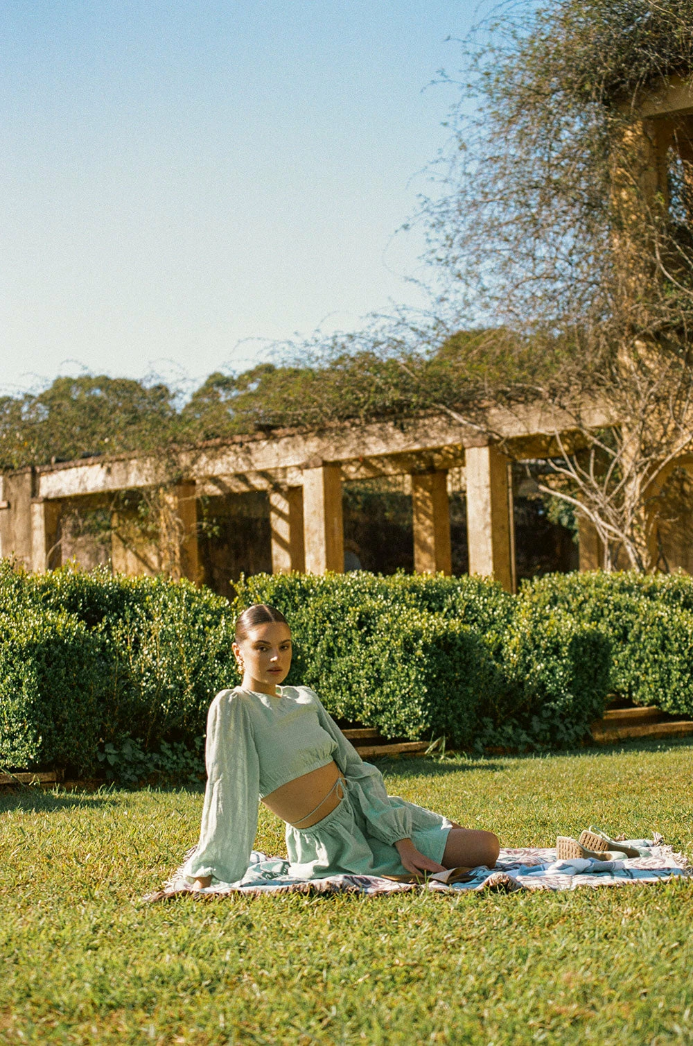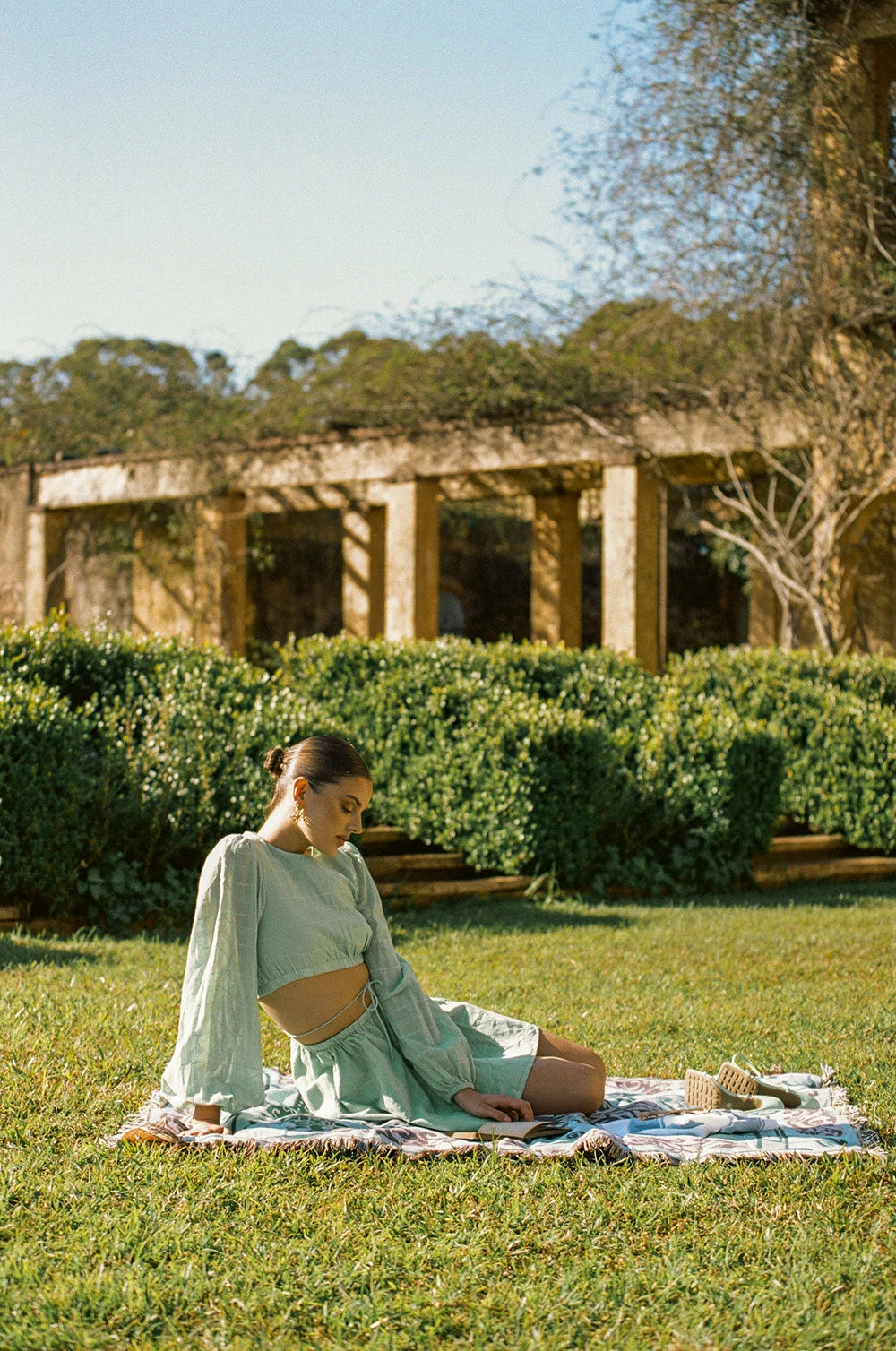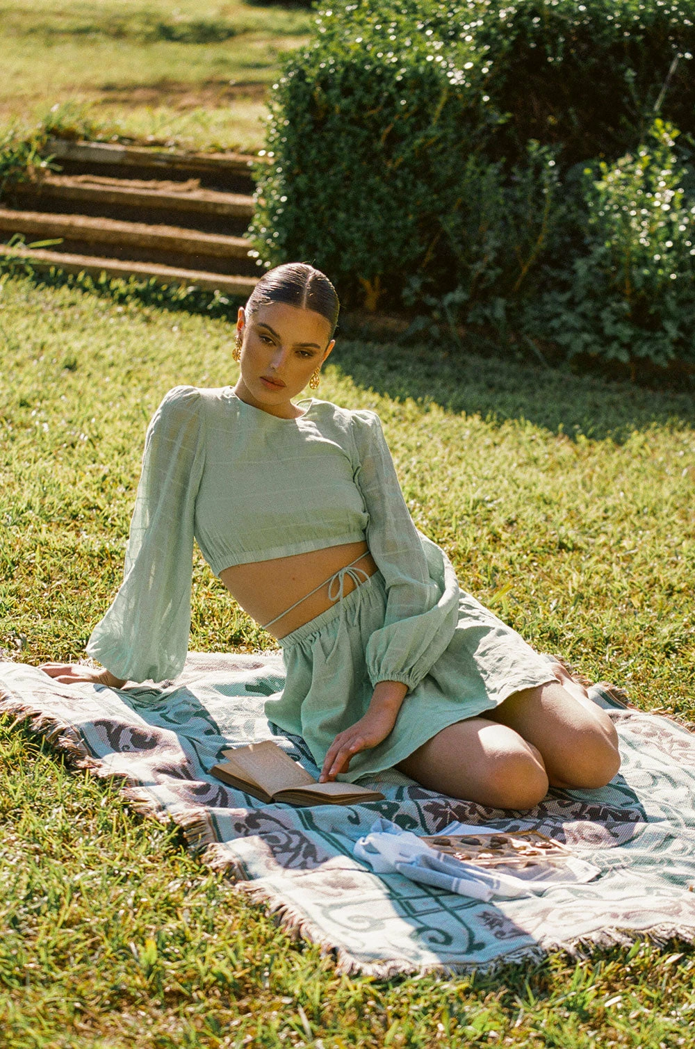 Inspired by warm sunny days in a vineyard, the Annie Dress is made from the most luscious delicate cotton fabric with self checks and stripes throughout in a pleasant green hue. It features semi sheer puff sleeves, a high neckline, cutout at waist with tie detail and flouncy skirt. Designed exclusively by Sabo.
