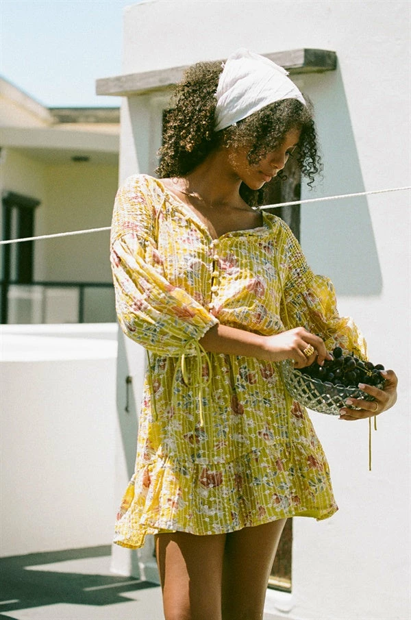 The perfect piece for your next event! The Anouk Dress is made from a mustard floral fabric with contrast embroidery throughout. It features covered buttons at centre front, tie at neck, shirred detailing at shoulders, short puff sleeves with ties, elasticated waist with drawstring and a flouncy twin tiered skirt. Dress it up with the Rico Handle Bag and Strappy Rafaela Heels! Designed exclusively by Sabo.