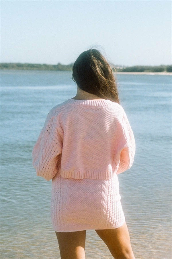 The sweetest set or super cute paired with jeans and a tank! The April Cardi is made from a cotton blend knit in a soft pink hue. It is a cropped style featuring full length sleeves, contrast rib trim detailing and cable and embroidered flower detailing down sides and sleeves. Designed exclusively by Sabo.