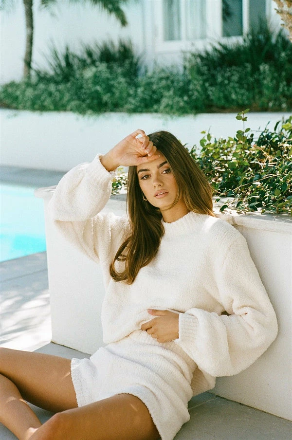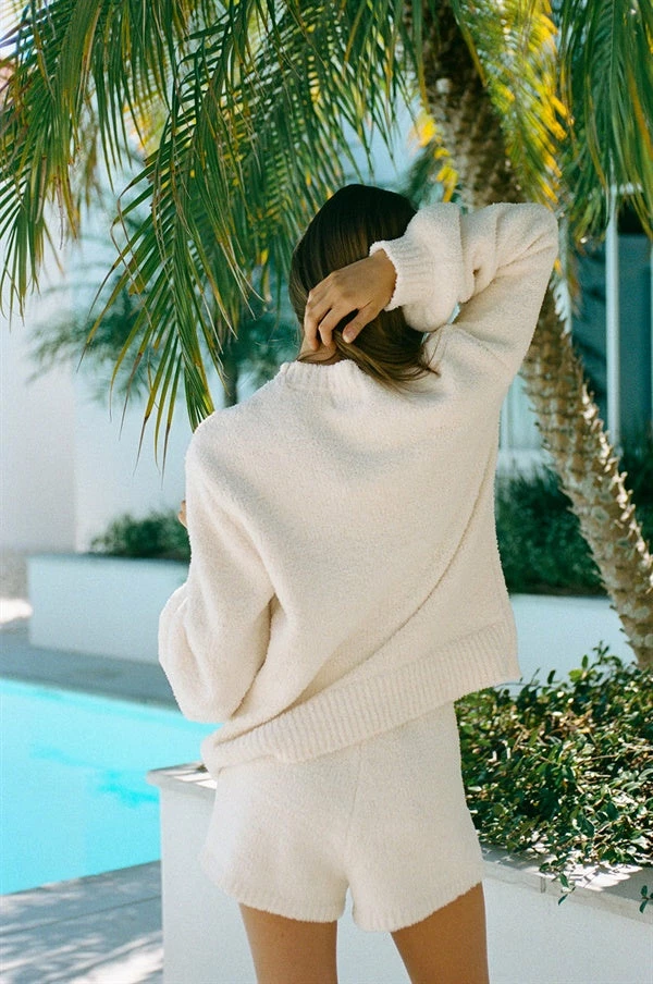 The ultimate cosy set! The Arcadia Knit Shorts are made from a soft sherpa fabric in a cream hue. They are a high waisted style featuring an elasticated waist, ribbed trims and high-low hems. Pair with the Arcadia Knit Sweater or the Dita Knit Top! Designed exclusively by Sabo.