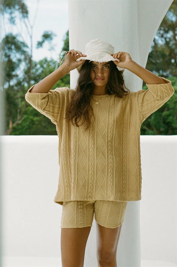The vintage inspired Archer Tee is made from a super soft woven tan fabric with a cable design throughout. It is a relaxed style featuring 1/2 length sleeves and a rounded neckline. Pair with the Archer Bike Shorts, Oval Amari Sunglasses and Rattan Backpack! Exclusively designed by Sabo.