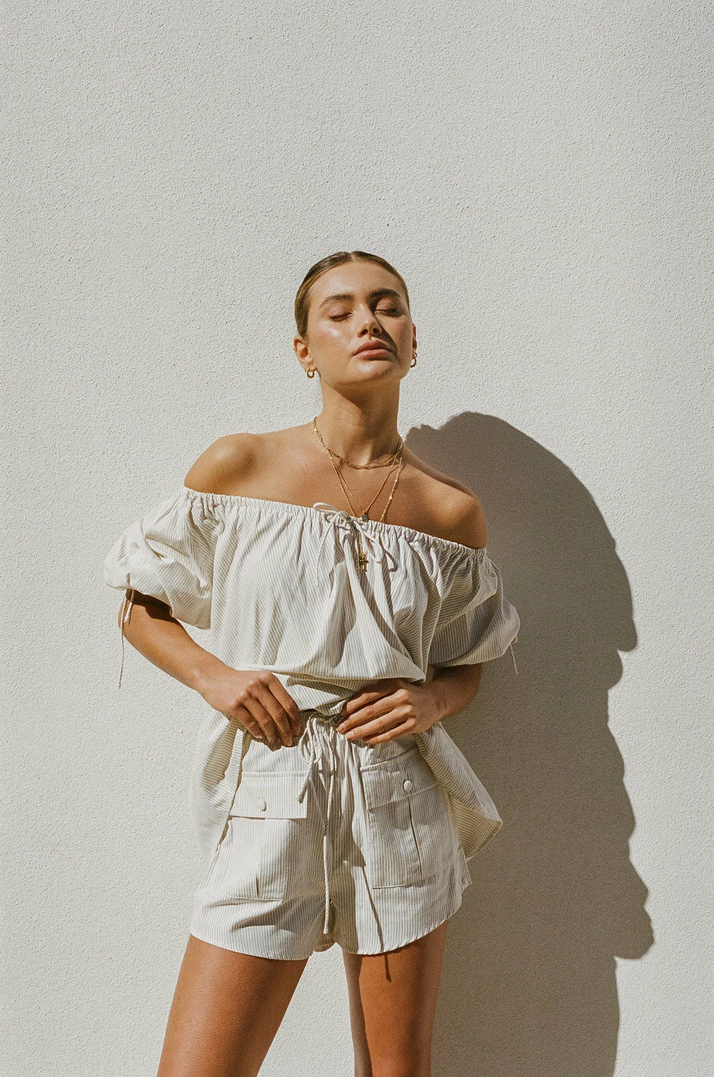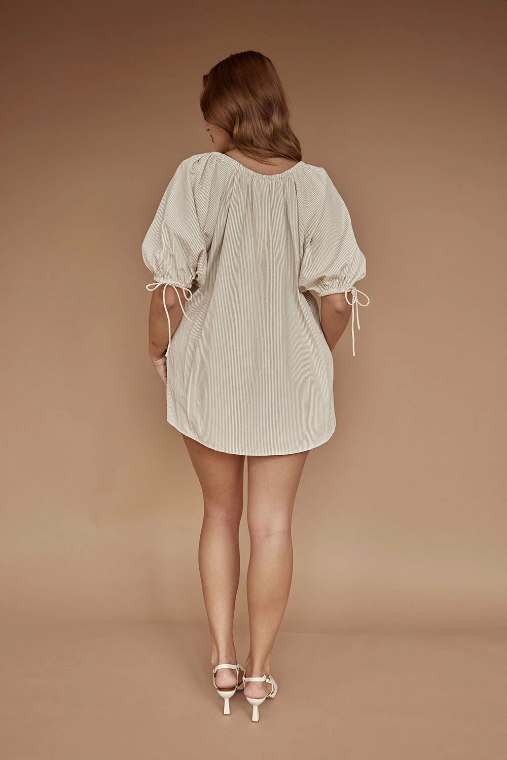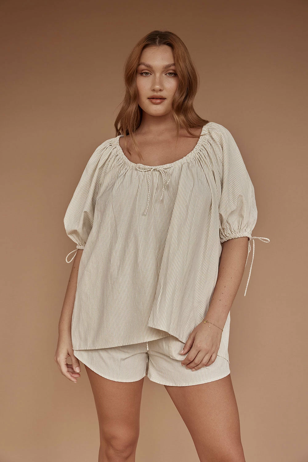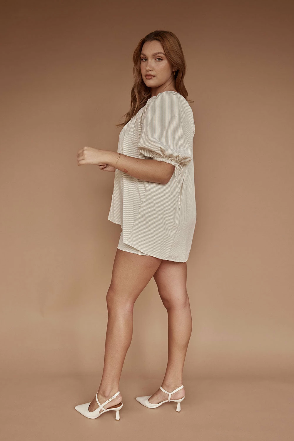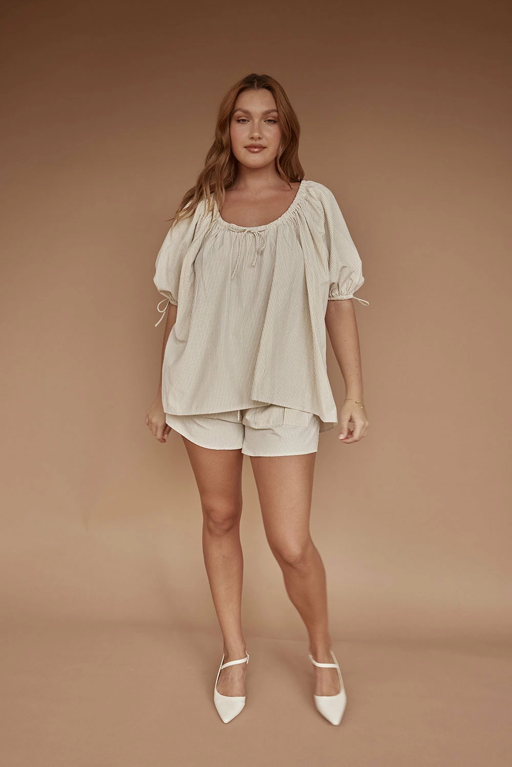The perfect throw-on vacay outfit! The Aubree Shorts are made from a natural beige cotton fabric with white stripes throughout. They are a high waisted style featuring an elasticated waist with draw tie, twin pockets at front and high-low hems. Get the set with the Aubree Top! Designed exclusively by Sabo.