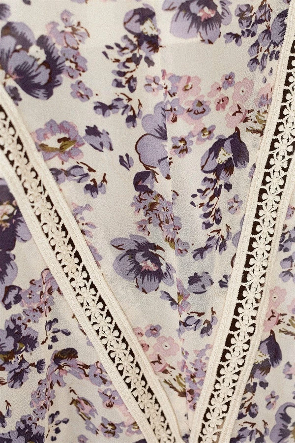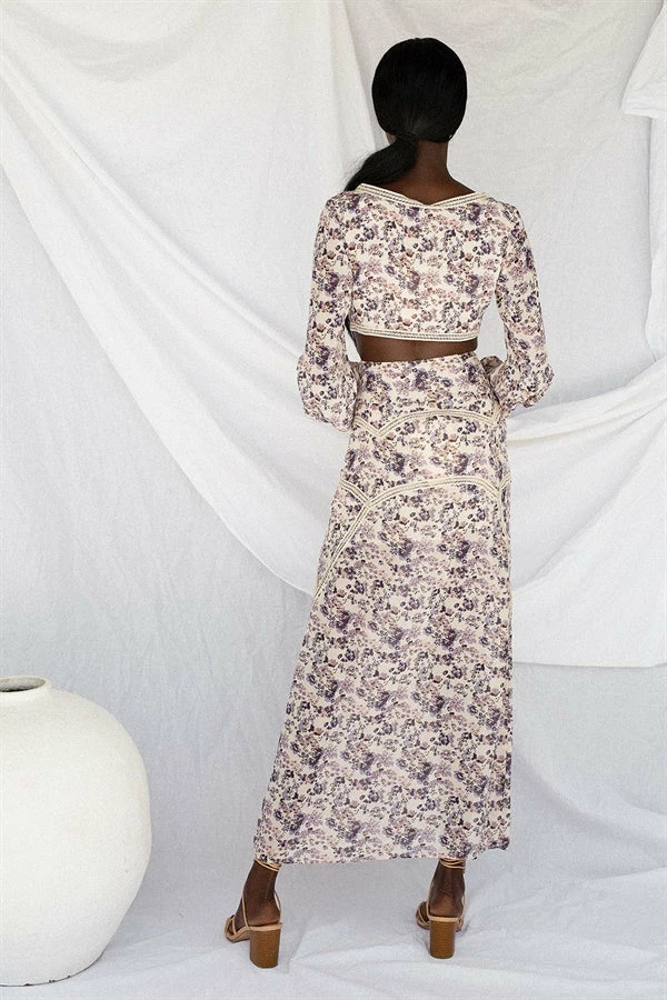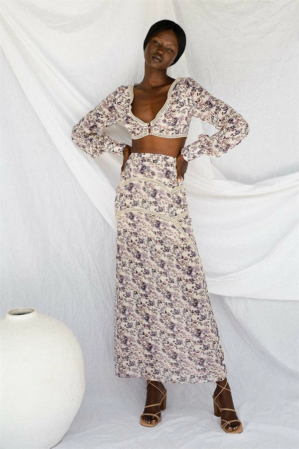 *THIS IS A FINAL SALE ITEM* The dreamy Aubrey Skirt from our A Day In Capri collection is made from a lightweight beige fabric with a lilac floral print throughout. It is a high waisted style featuring crochet lace trim detailing throughout and a flared hem. Pair with the Aubrey Top and 18K Twirl Ring! Exclusively designed by Sabo.