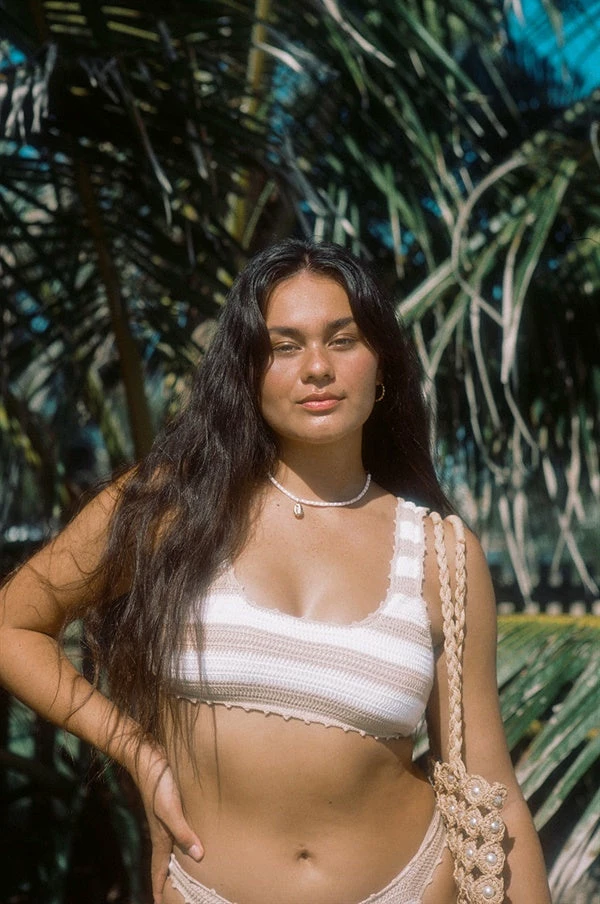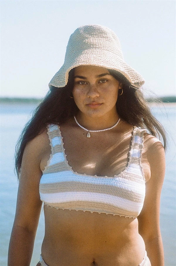 A vacation staple! The Avani Crochet Top is made from a natural cotton tan and white striped crochet with a stretchy lining. It is a bandeau style featuring thick straps, clip closure at back and circle trim detailing. Pair with the Avani Crochet Bottoms or wear it as a top under a button down top! Designed exclusively by Sabo.