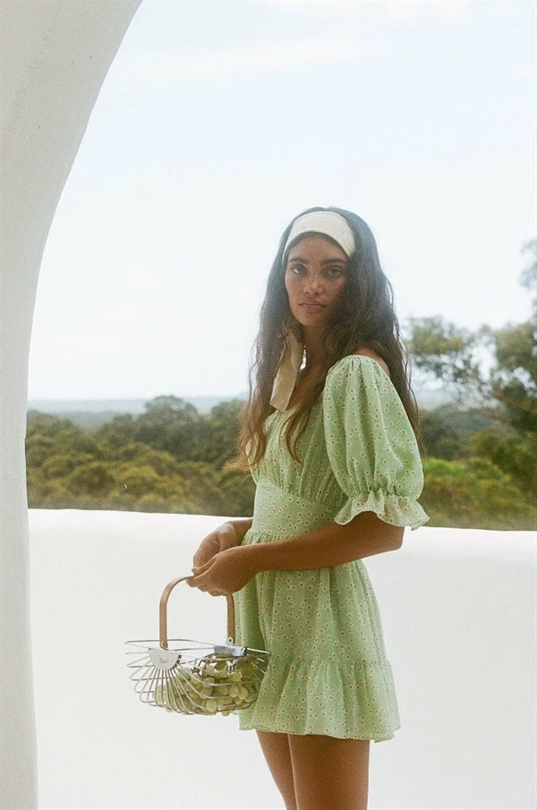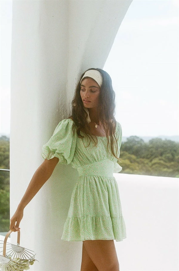 Inspired by Italian summers, designed to flatter! The Avery Dress is made from a lightweight fresh green fabric with our exclusive daisy print throughout. It features short puff sleeves with frill cuff detailing, scoop neckline, fitted waist and flouncy skirt with frill at hem. Pair with the Bold ID Bracelet and Artique Basket Bag for a super cute day time look! Exclusively designed by Sabo.
