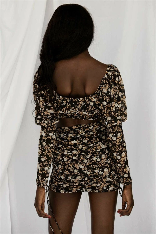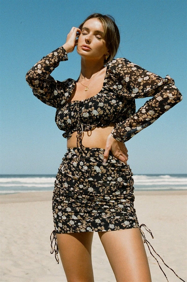 *THIS IS A FINAL SALE ITEM* The perfect party look has landed! The Avri Skirt is made from a lightweight black fabric with a floral print throughout. It is a high waisted style featuring drawstring and tie details at sides. Pair with the Avri Top, Strappy Noa Heels and Tulli Baguette Bag for your next night out! Exclusively designed by Sabo.