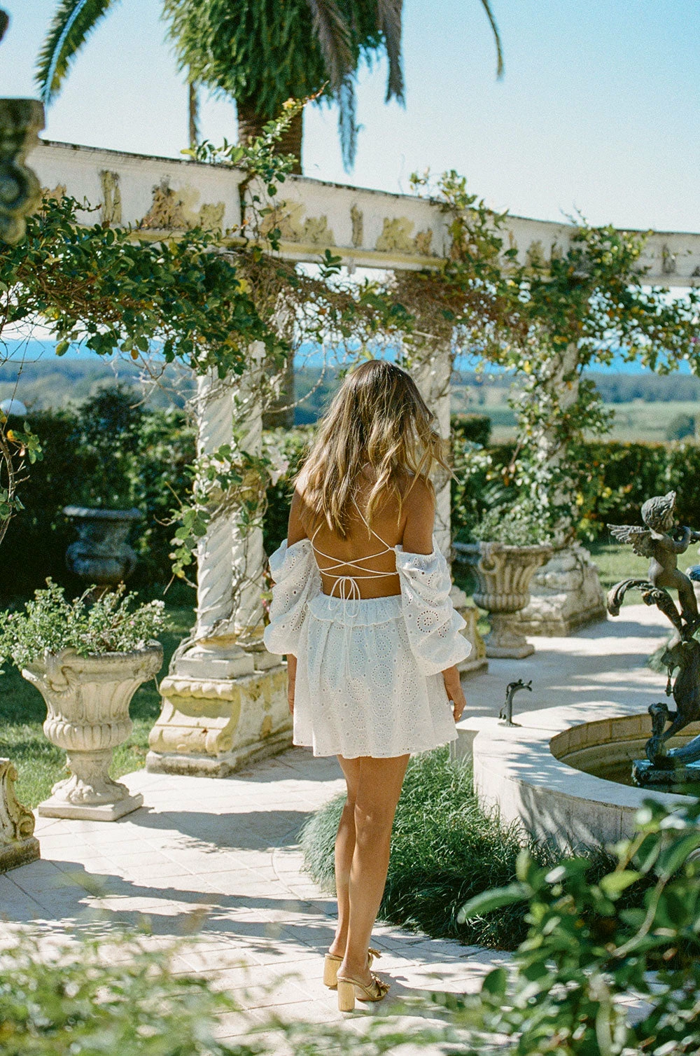 A LWD dripping with details! The Backless Ayla Dress is made from a natural cotton broiderie fabric in white. It is a backless style featuring a high halter neckline, puff sleeves, frill and cutout details at waist and flouncy skirt. The perfect date night outfit! Designed exclusively by Sabo.