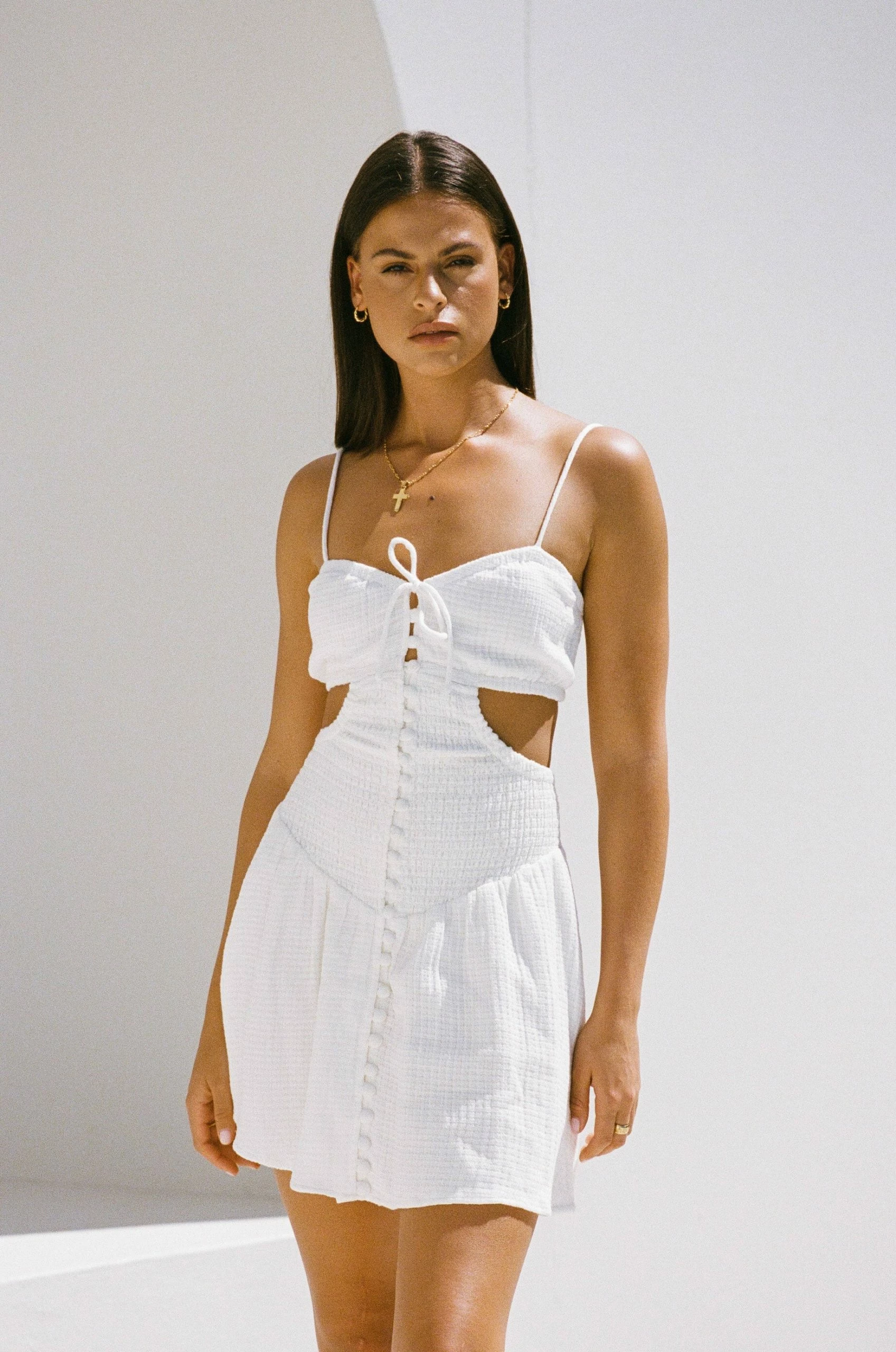 Inspired by warm vacation sunsets, the Backless Elana Dress is made from a high quality natural cotton fabric in a fresh white. It features an open back with tie closures, thin rouleau straps, tie at centre neckline, covered buttons down centre front, cutouts and shirred details at waist and a flouncy drop waist skirt. Style with the Strappy Ares Heels and Veronika Earrings! Designed exclusively by Sabo.