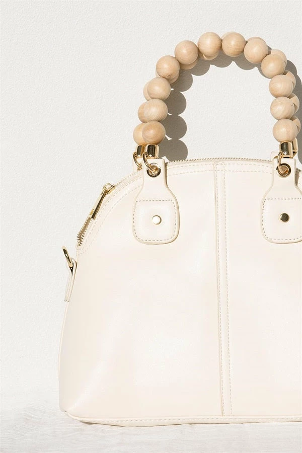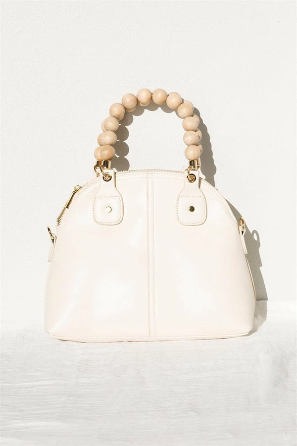 Structured neutral perfection! The Bead Handle Tote is made from a vegan leather in a cream hue. It is a structured tote style featuring twin wooden bead handles, inner pockets, detachable crossbody strap and gold toned zip and hardware. Exclusively designed by Sabo.