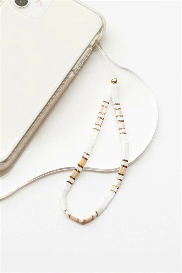 Accessorise your phone with the on-trend Beaded Phone Charm, featuring geo white, shell and nude beaded detailing.