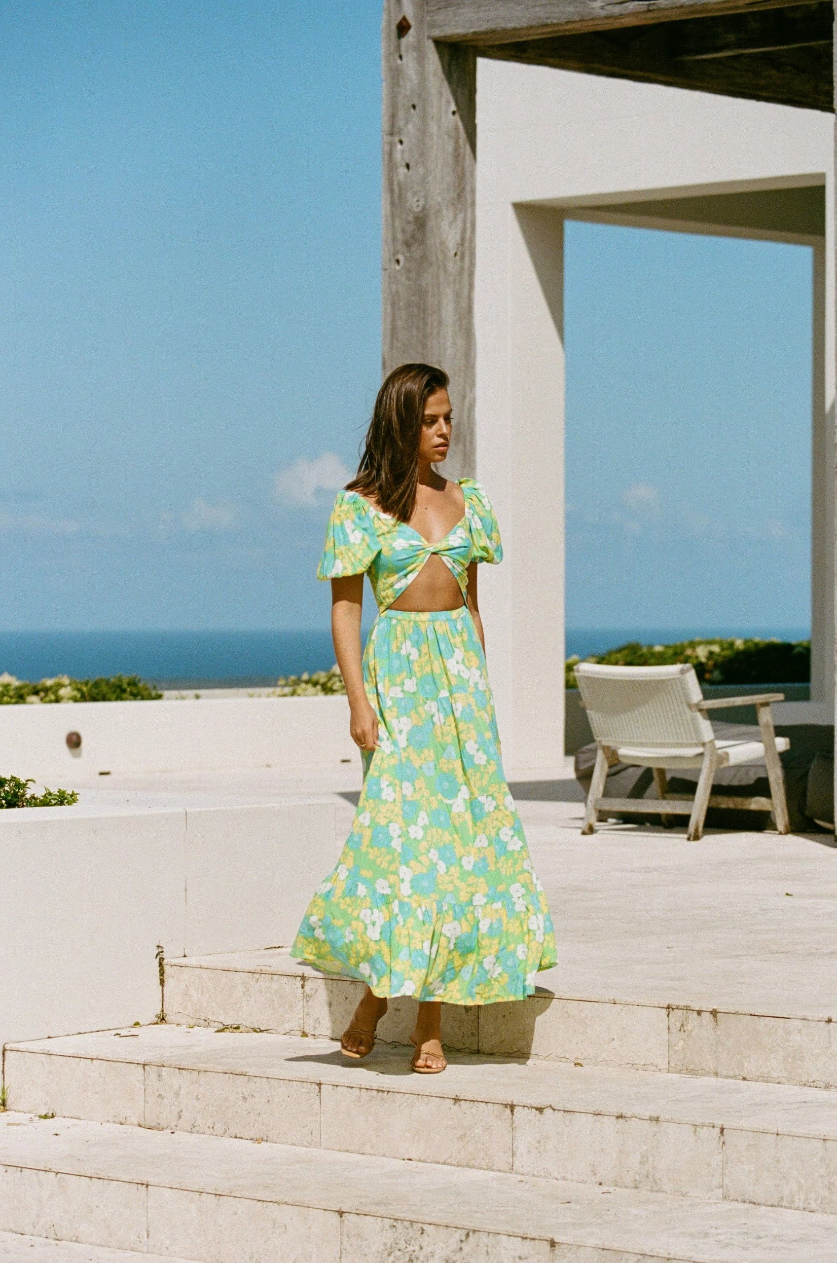 Stand out at your next event in the Belle Maxi Dress, made from a stunning viscose slub fabric with our exclusive new Bryony Tropical print. It features short puff sleeves, twist detail at centre bust, cutout at waist and a flowy tiered skirt. Style with the Tiana Bag and Strappy Rafaela Heels for your next night out! Designed exclusively by Sabo.