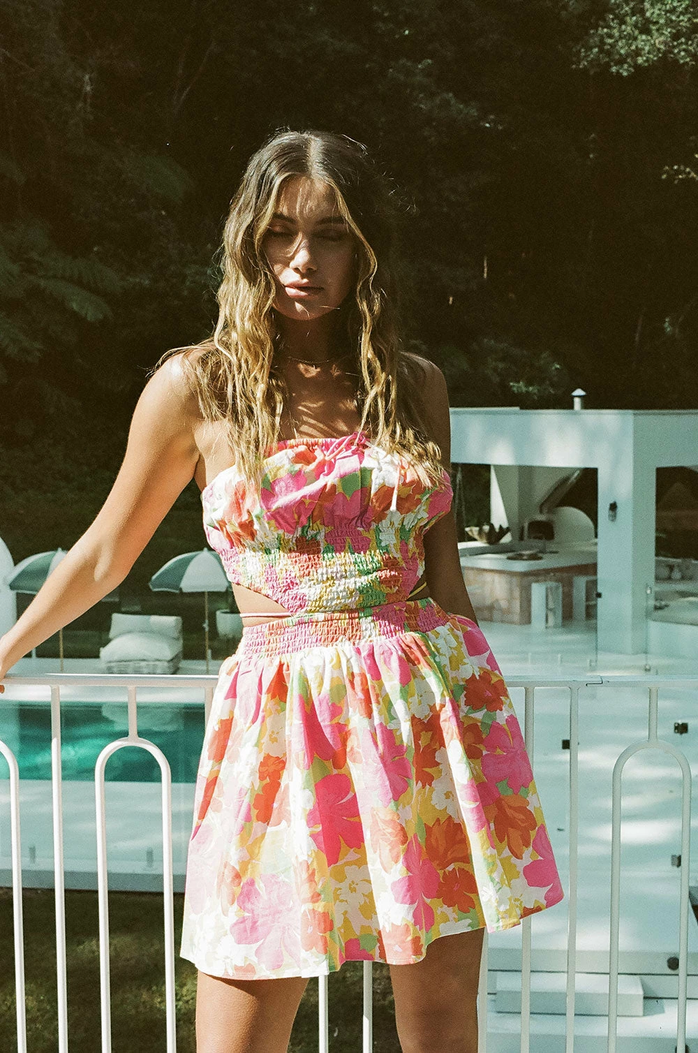 Introducing our exclusive tropical inspired pink pacific floral print! The Bianca Shirred Dress is made from a high quality natural cotton fabric and features a drawstring neckline with tie at centre, flattering shirred panels across waist, cutouts at waist with tie details and a super cute flouncy skirt. Dress it up with the Zita Strappy Sandals for your next night out! Designed exclusively by Sabo.
