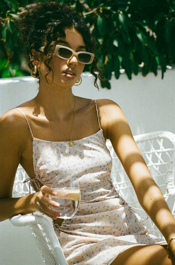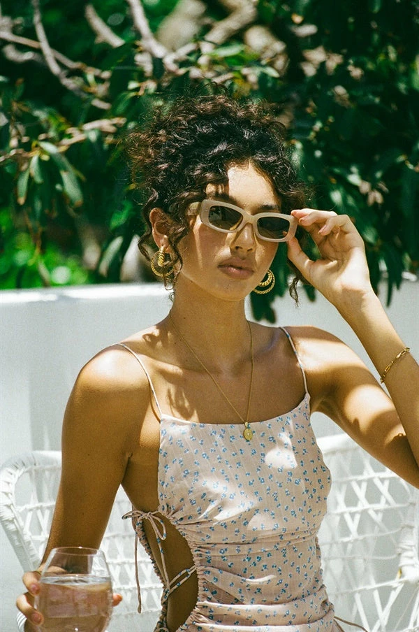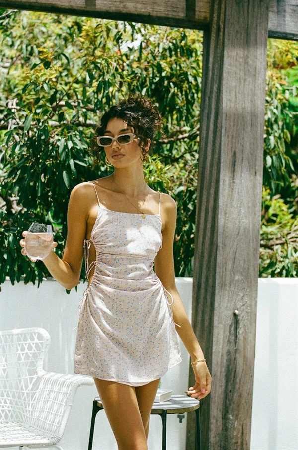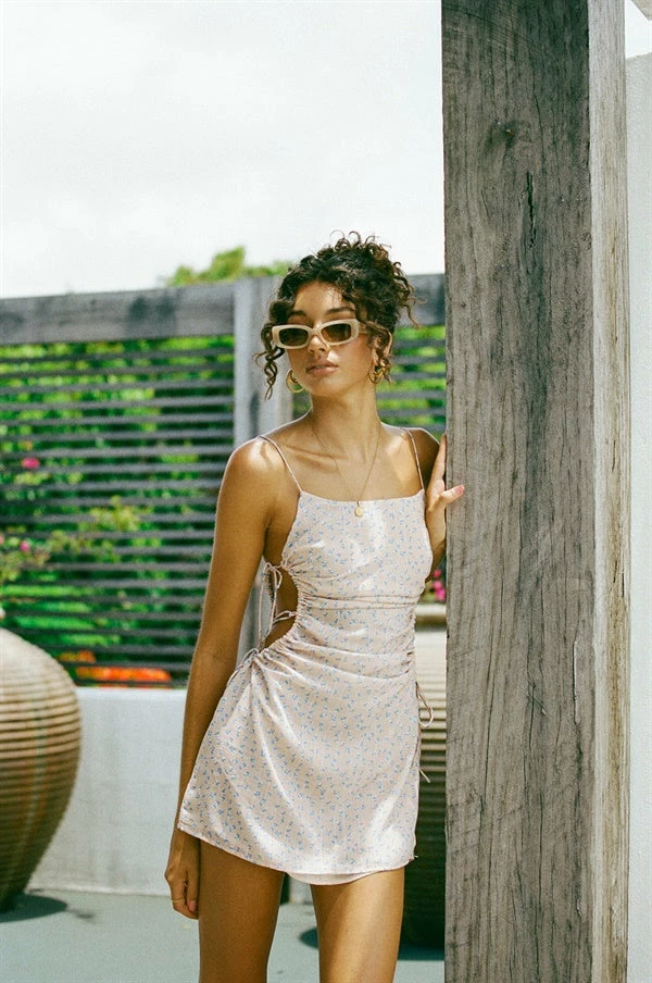 The perfect outfit for your next night out! The Bluebell Nara Dress is made from a chiffon-feel fabric in a peach hue with a floral print throughout. It features cutouts and ties at waist with thin drawstrings and a straight neckline. Complete the look with the Transparent Mules and Rico Handle Bag! Designed exclusively by Sabo.