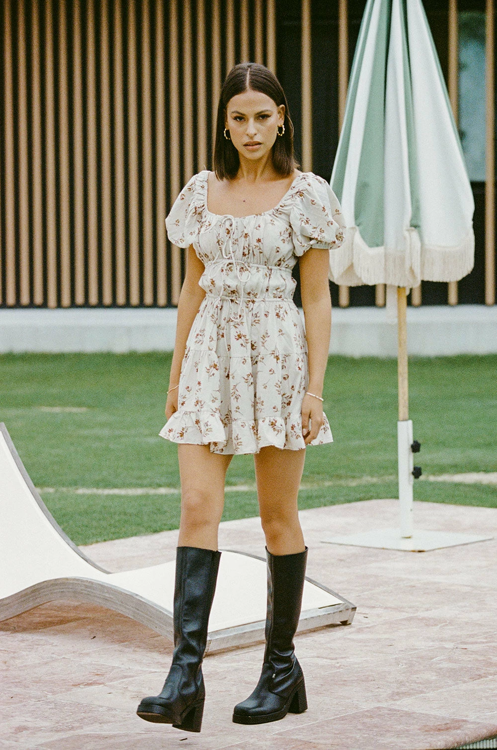The perfect piece for a lunch! The Bria Dress is made from a lightweight beige fabric with a tan floral print throughout. It features short puff sleeves, elastic and draw tie details at bodice and a flouncy skirt. Exclusively designed by Sabo.