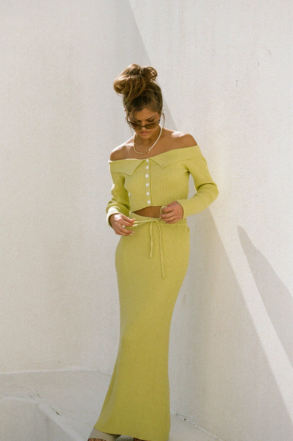 A super comfy shape in a bold hue! The Briana Maxi Skirt is made from a natural ribbed cotton fabric in a chartreuse hue. It is a high waisted style featuring an elasticated waist with draw detail. Get the set and pair with the Briana Top! Designed exclusively by Sabo.