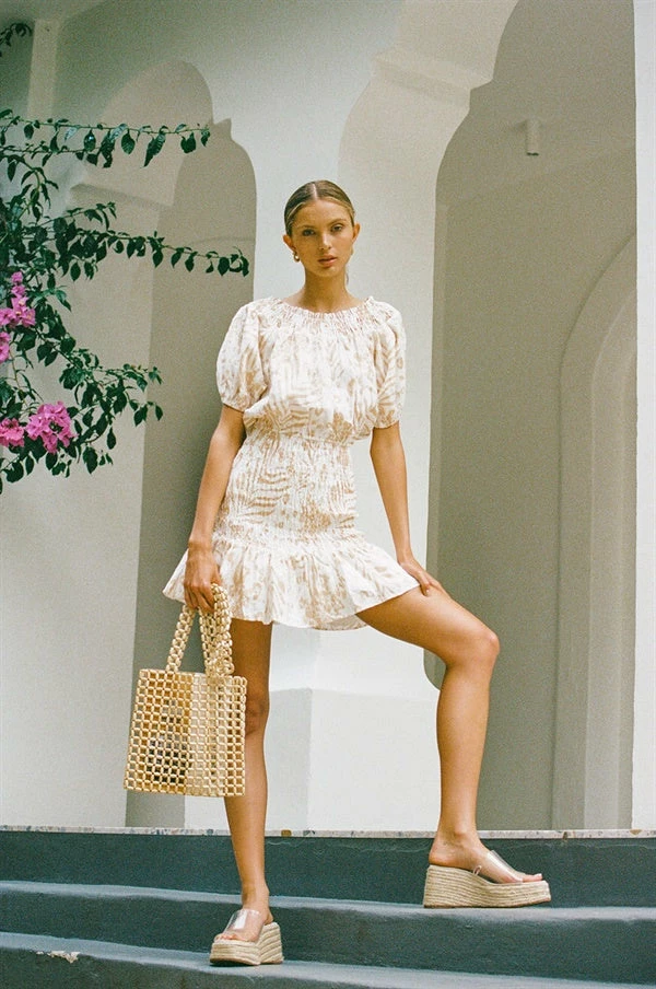 The perfect party dress fitted in all the right places! The Camari Linen Dress is made from a natural linen fabric with our exclusive animal print. It features short puff sleeves, a rounded shirred neckline, relaxed bodice, wide shirred waist and frill at hem. Dress it up with the Strappy Ramos Heels for your next event! Designed exclusively by Sabo.