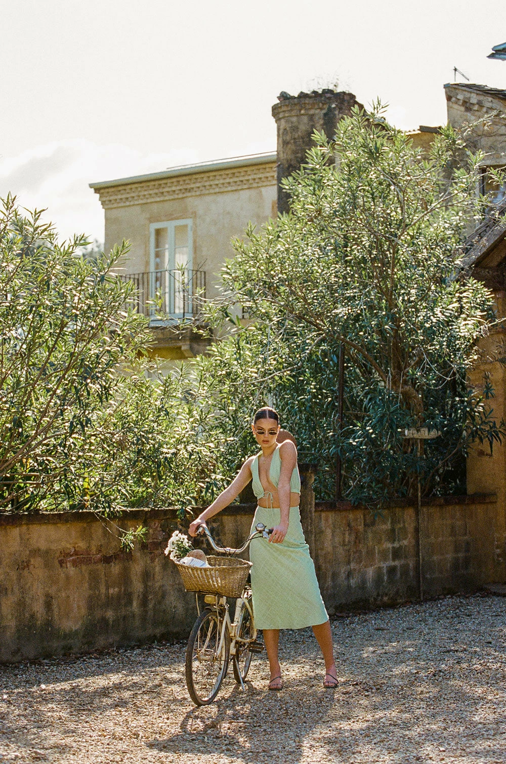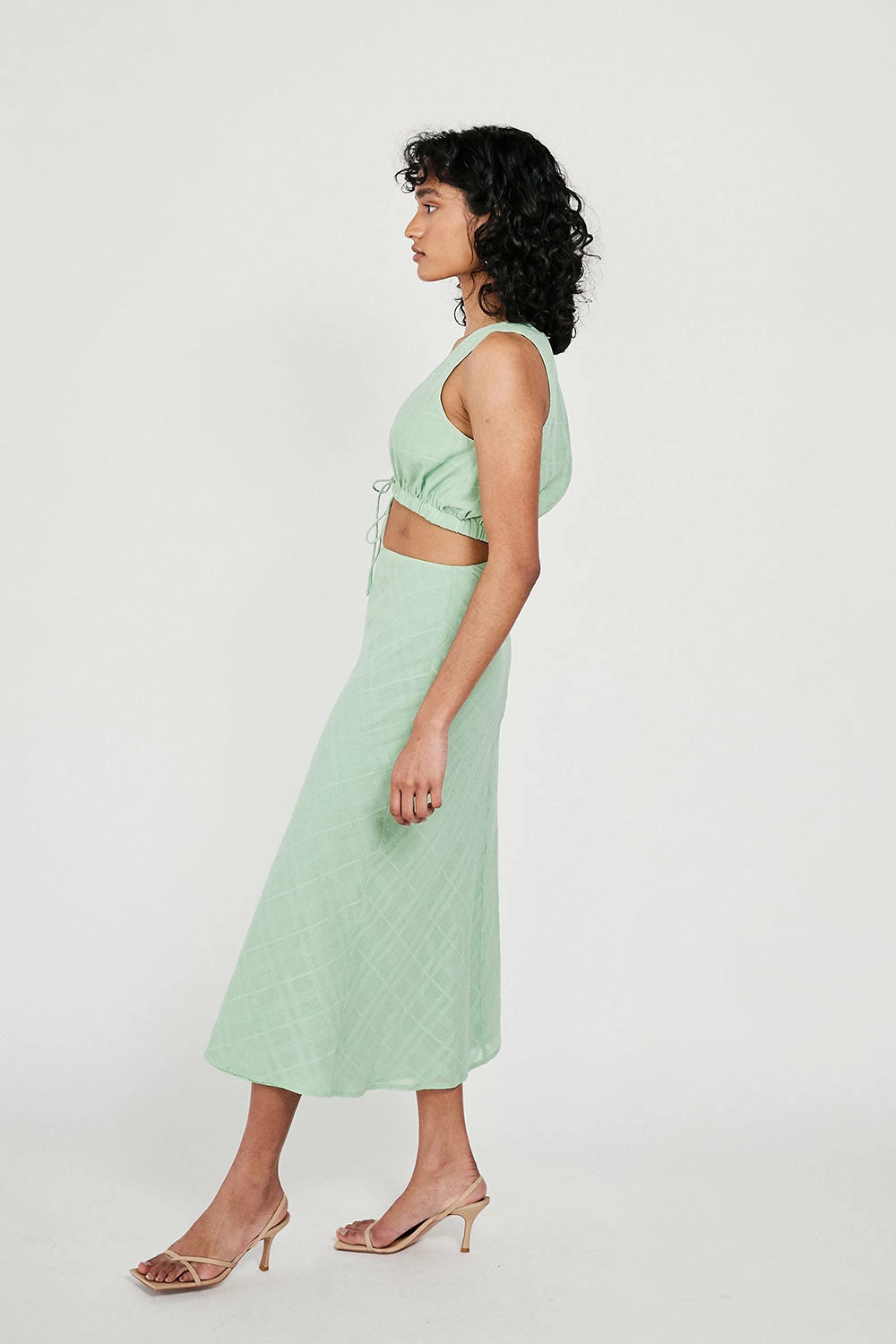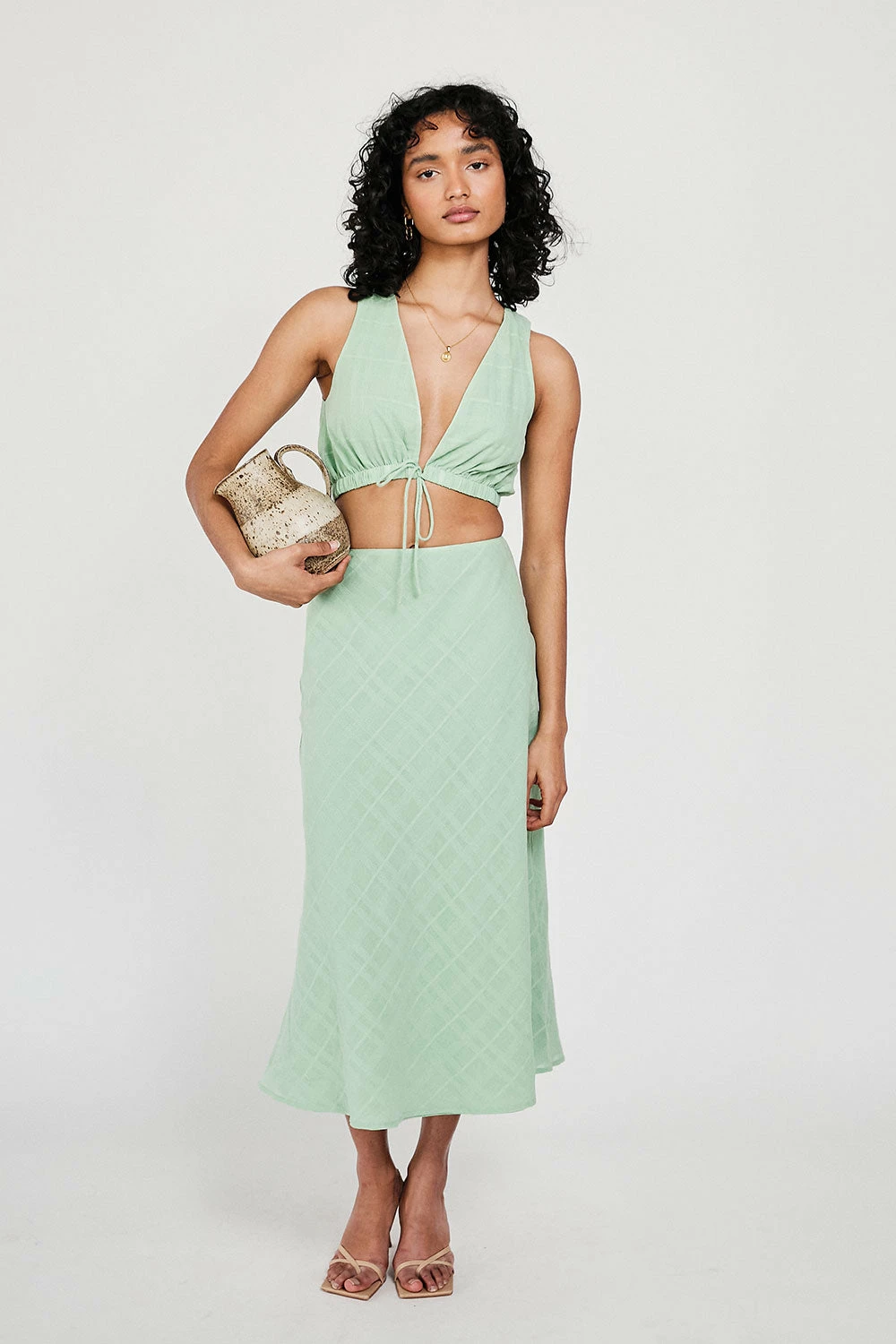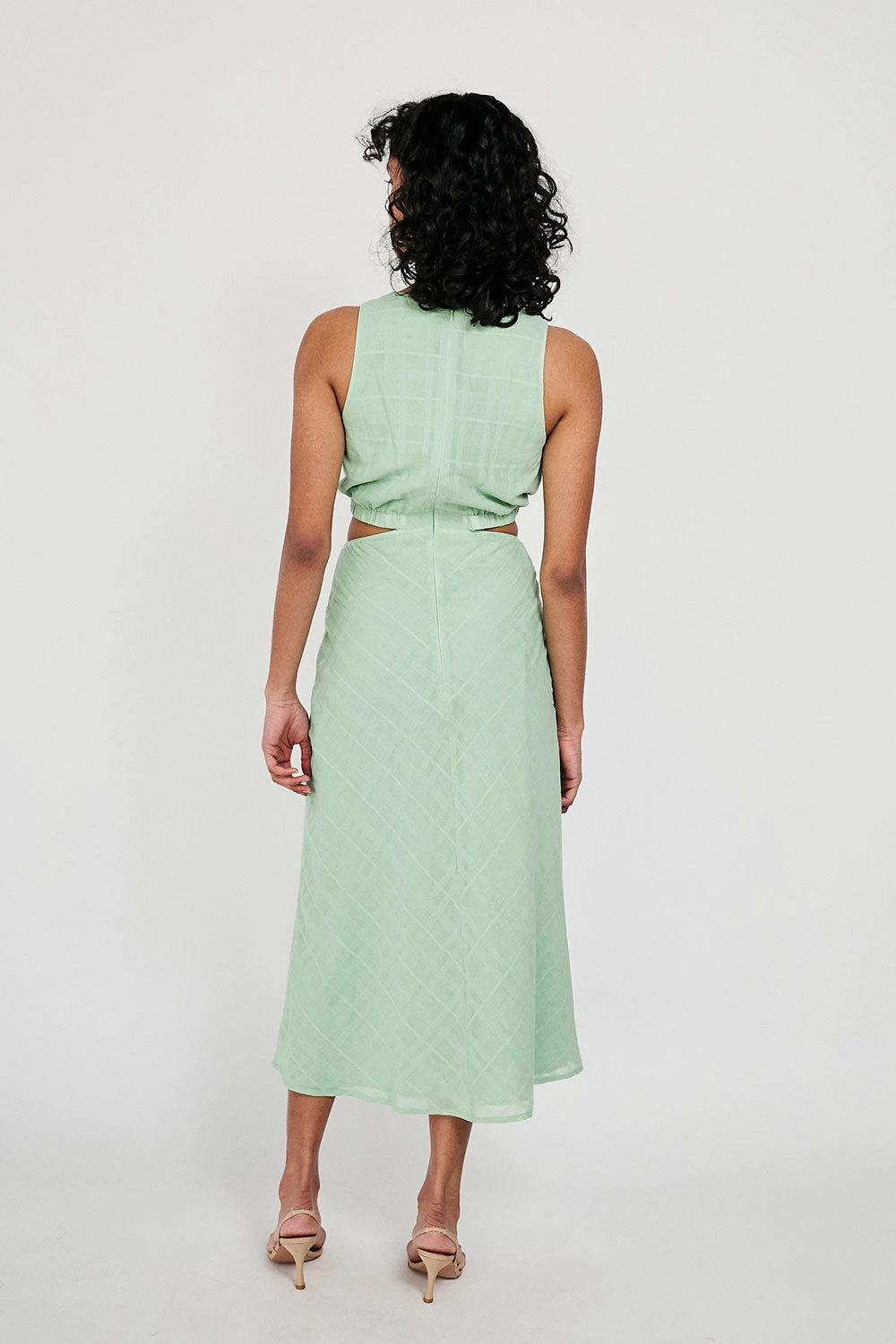 A classic shape in a swoonworthy hue! Made from the most luxurious delicate cotton fabric with self check and stripe details, the Cambelle Dress features a plunging neckline with tie at centre bust, cutout at waist and midi skirt. Designed exclusively by Sabo.
