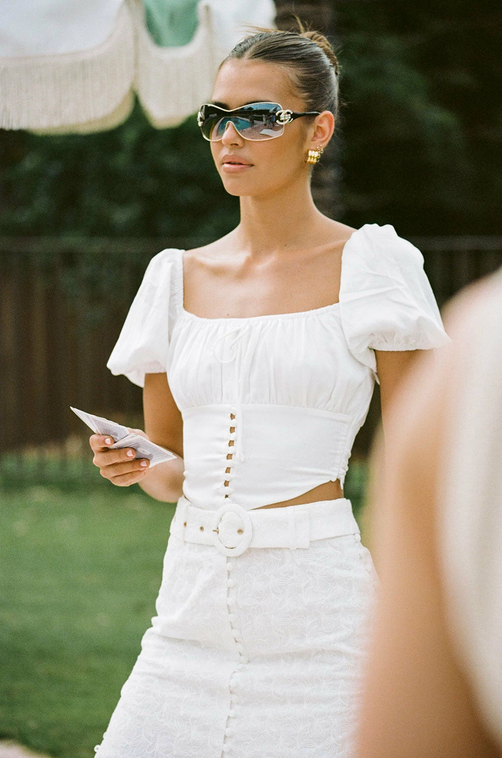 The perfect way to dress up your denim! The super cute Camille Top is made from a silky white fabric and features short puff sleeves, tie at centre neckline, covered buttons at centre waist and a curved hem. Style your look with jeans and the Milana Bag! Designed exclusively by Sabo.
