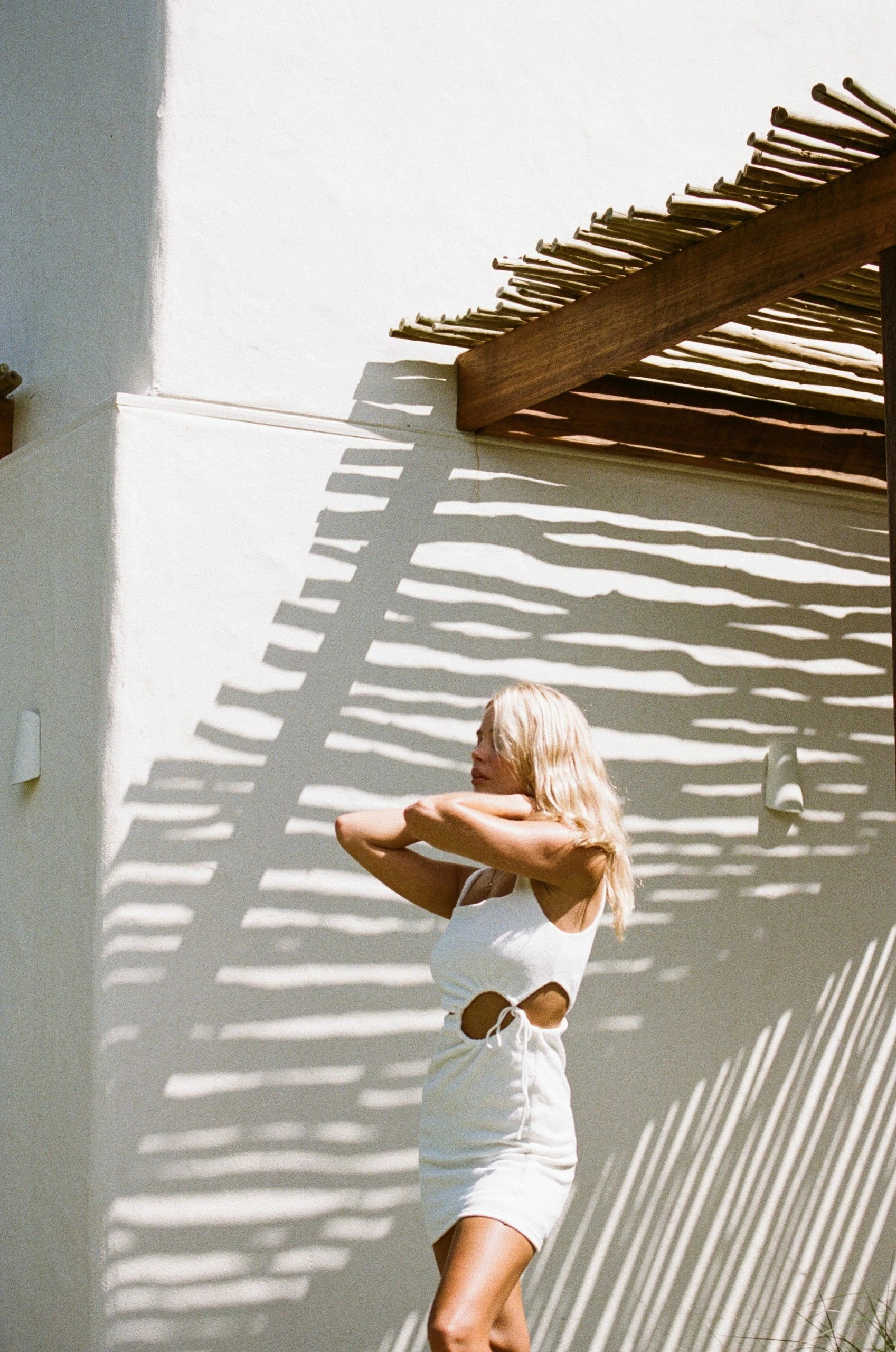 Clean lines, cutouts and texture! The Casa Cutout Dress is made from a woven fabric in an off white hue. It is a fitted style featuring a square neckline, cutouts at waist and tie detail. Keep it casual with sandals and a tote or dress it up with heels and gold accessories! Designed exclusively by Sabo.