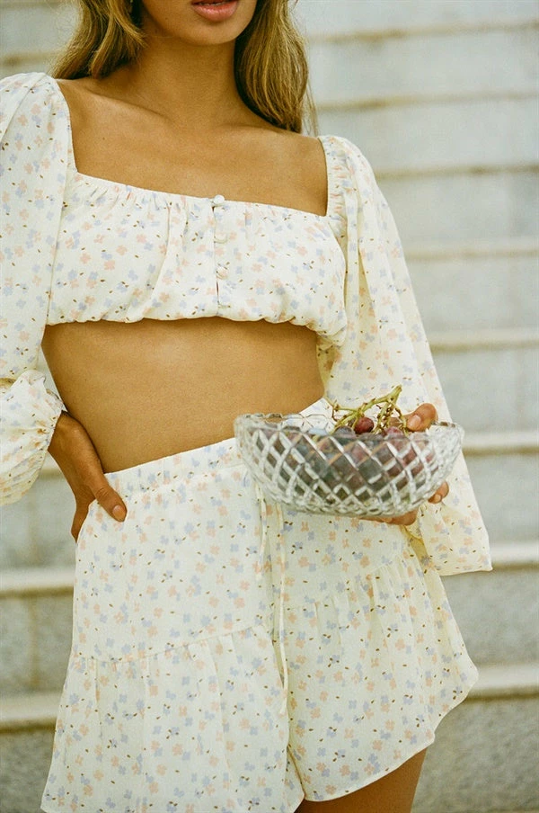 *THIS IS A FINAL SALE ITEM* Feminine vibes with the Cayenne Top, made from a lightweight yellow fabric with our floral buttercup print throughout. It is a cropped style featuring a bandeau bodice with covered button detailing at centre front and full length puff sleeves. Get the look with the Cayenne Shorts and Marquee Earrings! Designed exclusively by Sabo.