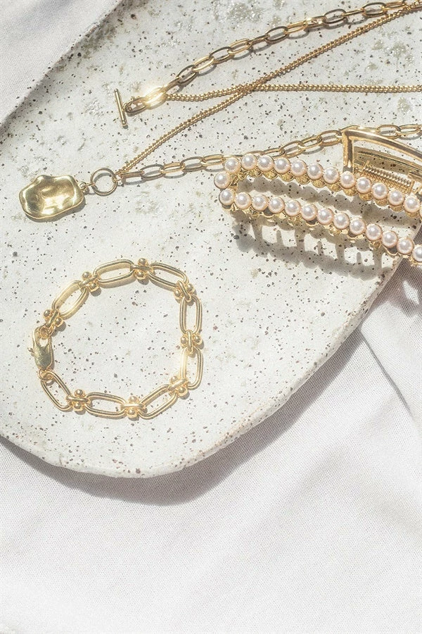 Perfect for stacking, the Cel Link Bracelet is gold toned and features oval link detailing and a clasp closure. Pair with gold earrings to take your outfit to the next level!