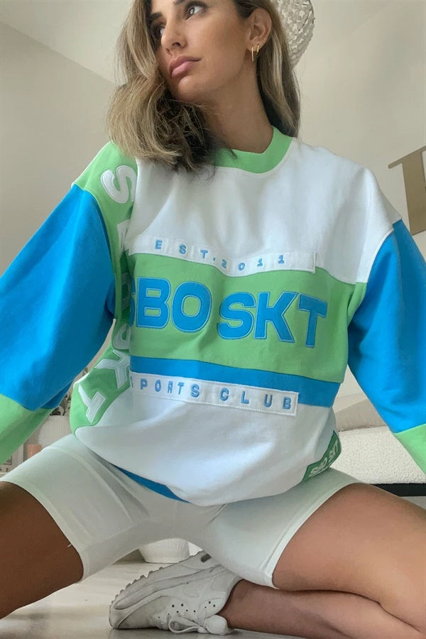 The Chance Sweater is made from a natural terry back cotton fabric in blue, green and white hues. It is an oversized relaxed uni-sex style featuring a crew neckline, full length sleeves and embroidered detailing throughout. Pair with the Max Bike Shorts and sneakers! Designed exclusively by Sabo.