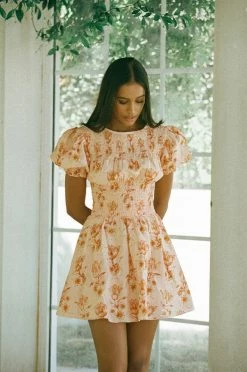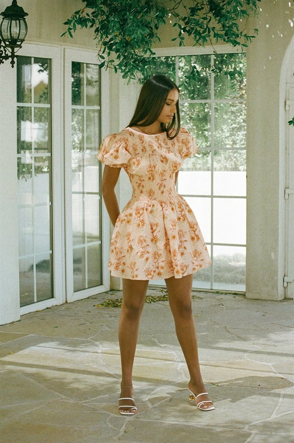 *BACK IN STOCK* Feminine and classy, perfect for an event! The Charlize Shirred Dress is made from a raw natural cotton fabric with our exclusive blushing tulip floral print throughout. It features a high rounded neck with shirring across neckline and waist, short puff sleeves with ruffle detailing and a flouncy skirt. Complete the look with the Lena Mules and gold accessories! Exclusively designed by Sabo.