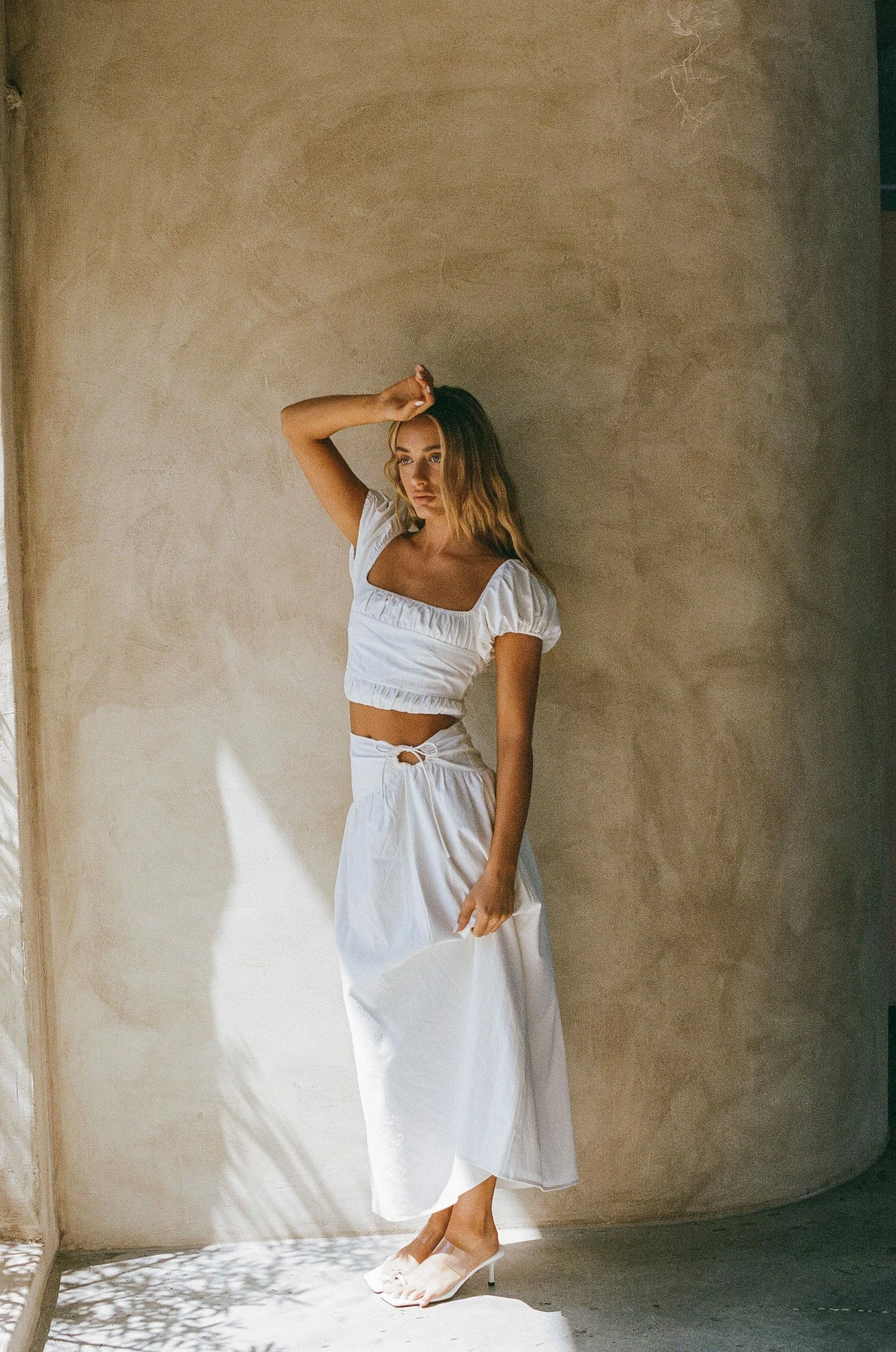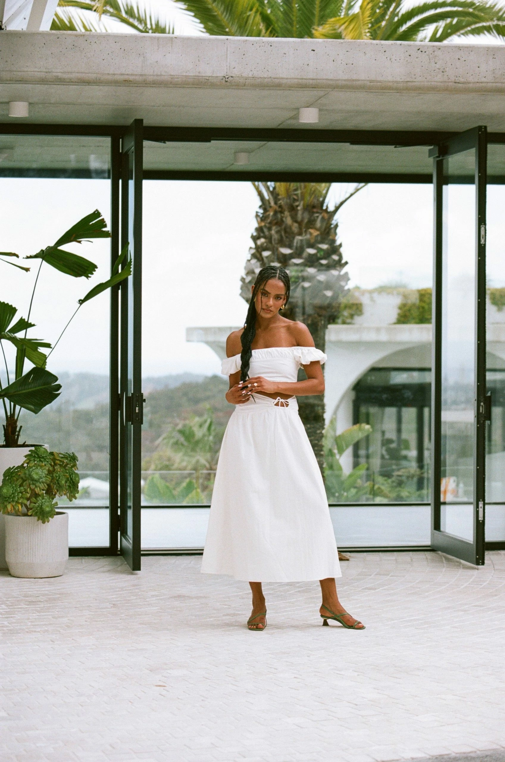 The must-have Dahana Midi Skirt is made from a structured cotton fabric in white. It is a high waisted style featuring an asymmetric fitted panel across waist with cutout detail and flouncy skirt. Get the set with the Dahana Top! Designed exclusively by Sabo.