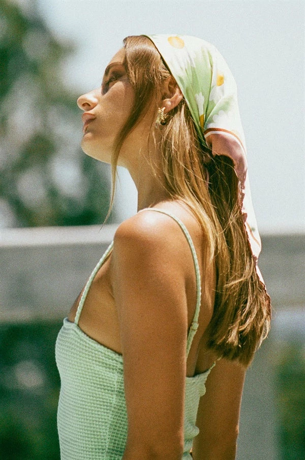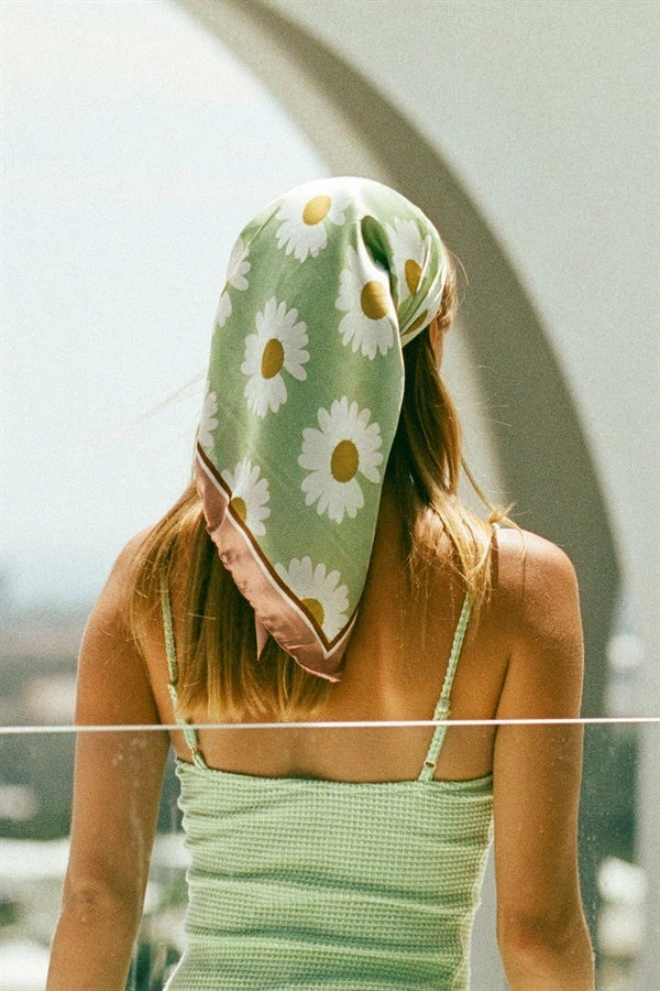 Accessorise your hairstyle, tie it on your bag or use it as a cute neck scarf! The Daisy Scarf is made from a silky green fabric featuring a floral print throughout.