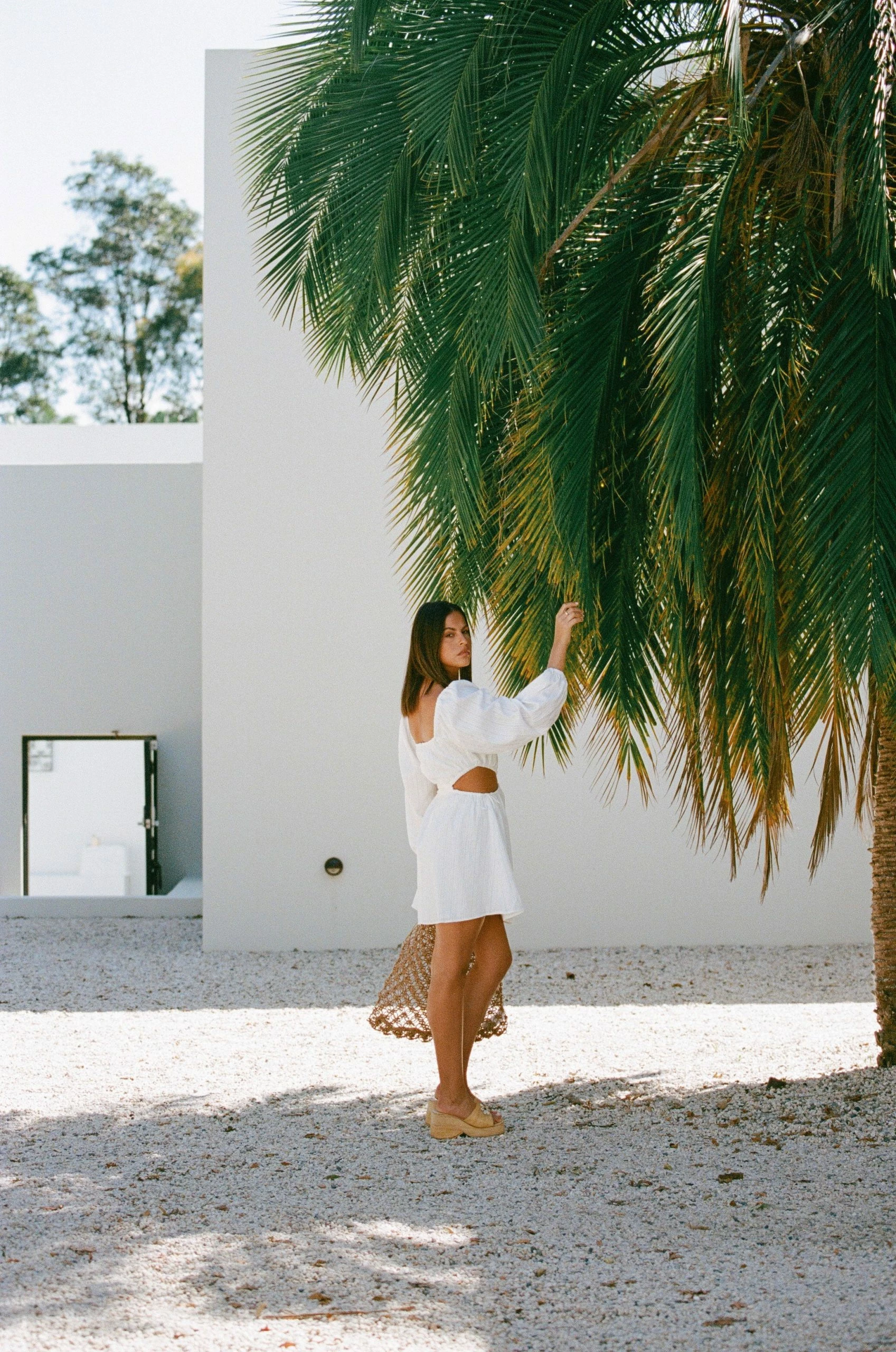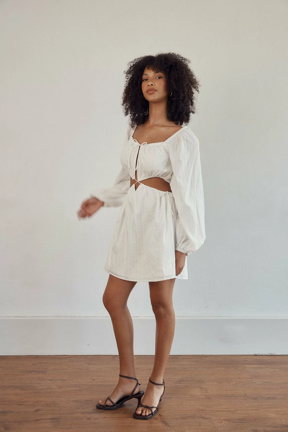 Perfect for a summer sunset! The Dasha Cutout Dress is made from a stunning natural cotton fabric with a vertical dobby stripe throughout. It features full length puff sleeves drawstring at neckline, cutouts at bodice and a flouncy skirt. Dress it up with heels and gold accessories for a night out! Designed exclusively by Sabo.