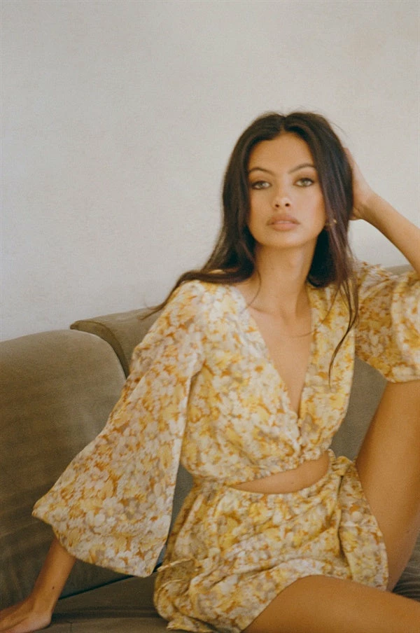 Our cult favourite Dharma Playsuit now comes in a fresh new print! It is made from a yellow chiffon fabric with a floral print throughout. It features full length puff sleeves, cutout at waist, covered buttons at centre front, twin pockets and high-low hems. Complete the look with the Link Earrings! Designed exclusively by Sabo.