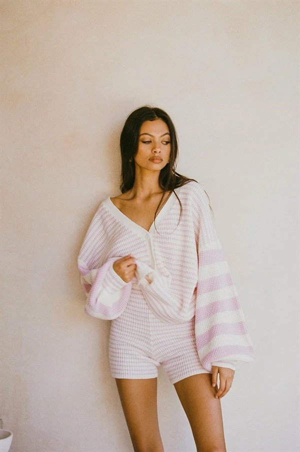 *THIS IS A FINAL SALE ITEM* A cute and cosy style in the most pleasant colourway! The Diaz Cardi is made from a soft knitted fabric in light cream and pink hues. It is a relaxed style featuring a V neckline with buttons at centre front, drop shoulders and full length puff sleeves with contrast stripes and fitted cuffs. Get the look with the Diaz Cardi and Jersey Scrunchie! Designed exclusively by Sabo.