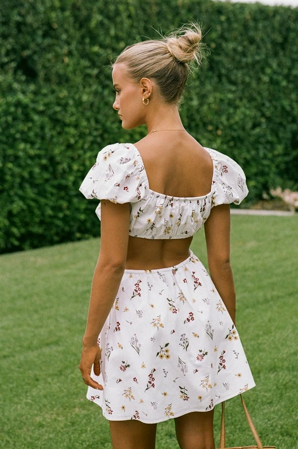 Dress it up with heels or keep it casual with sandals or sneakers! The Eilish Dress is made from a high quality natural cotton fabric with our exclusive native sprig floral print. It features flattering cutouts at waist with ties at sides, short puff sleeves, elasticated cups with tie at centre, and a flouncy skirt. Back waist designed to drape low. Designed exclusively by Sabo.
