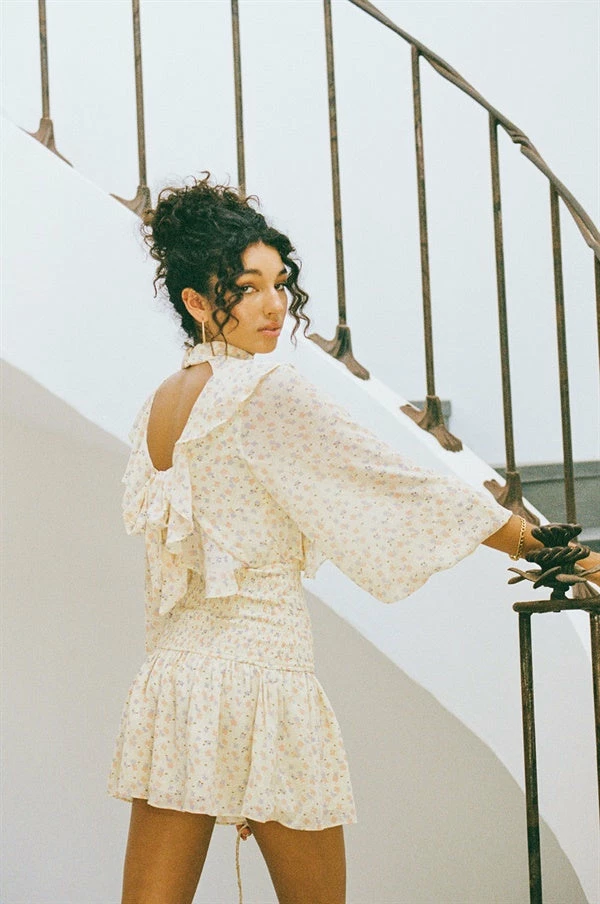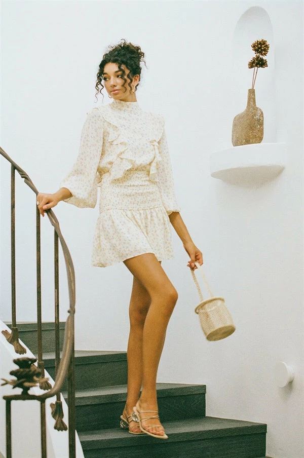 We’ve got your next event covered! The Elia Dress is made from a lightweight yellow fabric with a floral print. It is a high neck style featuring an open back detail, frills down bodice, full length puff sleeves, a shirred waist and flouncy skirt. Style your look with Transparent Mules and Jolie Chain Bag! Designed exclusively by Sabo.