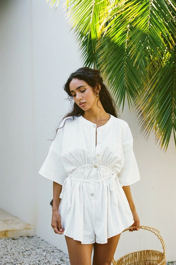 For the lovers of structured style! The Eliana Playsuit is made from a raw cotton fabric with contrast tan stitching throughout. It is a relaxed style featuring drop shoulders and short sleeves, buttons down centre front and double draw and tie detailing at waist. Designed exclusively by Sabo.