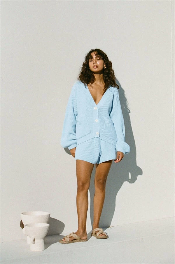 The super cosy Ellis Shorts are made from a soft knitted fabric in a blue hue. They are a high waisted style featuring a ribbed elasticated waist with drawstring and high-low hems. Complete the look with the Ellis Cardi and SBO Crew Socks! Exclusively designed by Sabo.