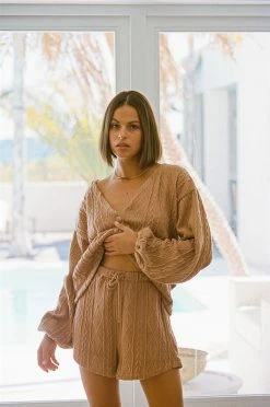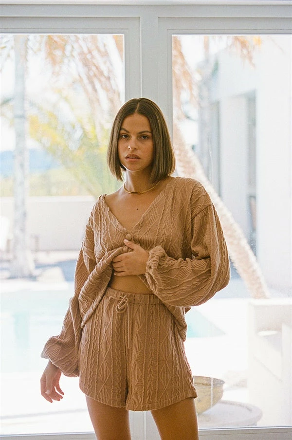 *THIS IS A FINAL SALE ITEM* The super cosy Ellis Shorts are made from a soft woven tan fabric with a cable design throughout. They are a high waisted style featuring an elasticated waist with drawstring and high-low hems. Complete the look with the Ellis Cardi and Lattice Mini Backpack! Exclusively designed by Sabo.