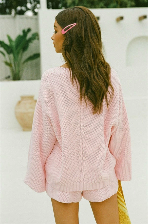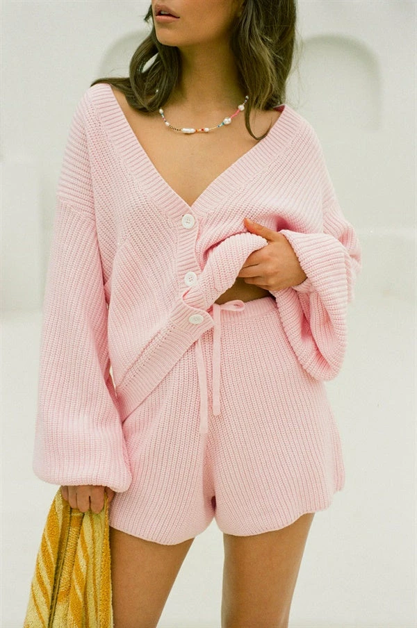 The super cosy Ellis Shorts are made from a soft knitted ribbed fabric in a pink hue. They are a high waisted style featuring a ribbed elasticated waist with drawstring and high-low hems. Complete the look with the Ellis Cardi and Crescent Bag! Designed exclusively by Sabo.