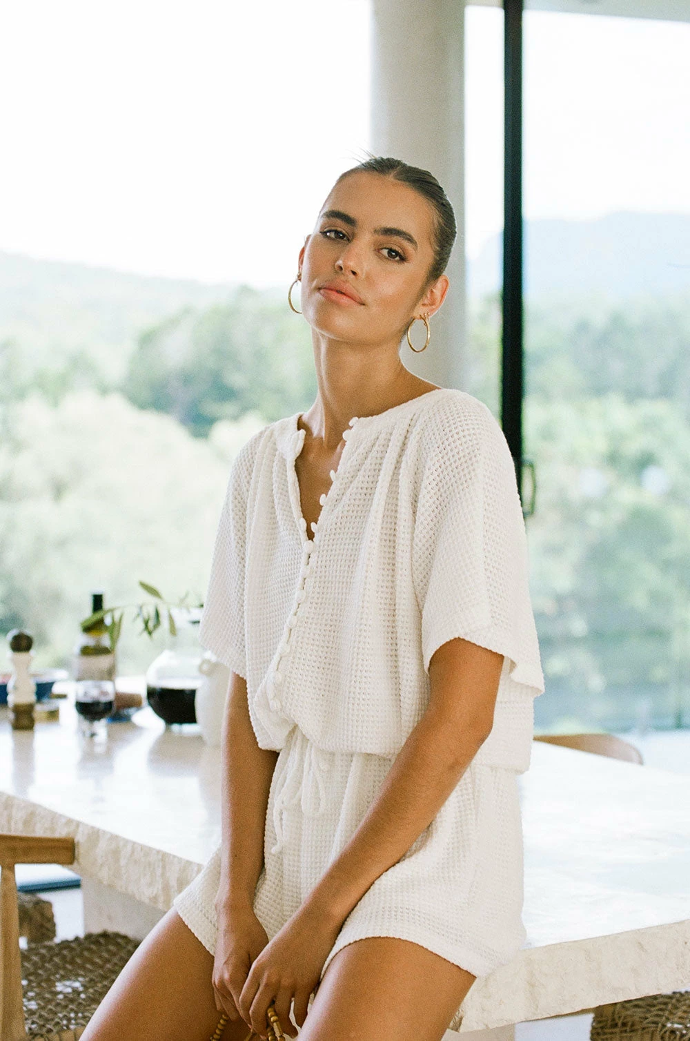 The super easy-to-wear Elsa Playsuit is back! It is made from a soft woven fabric in an off white hue. It features covered buttons down centre front, short sleeves, an elasticated waist with drawstring and high-low hems. Complete the look with the Nadia Pleated Bag and Glow Necklace! Exclusively designed by Sabo.