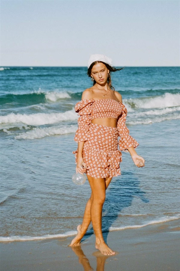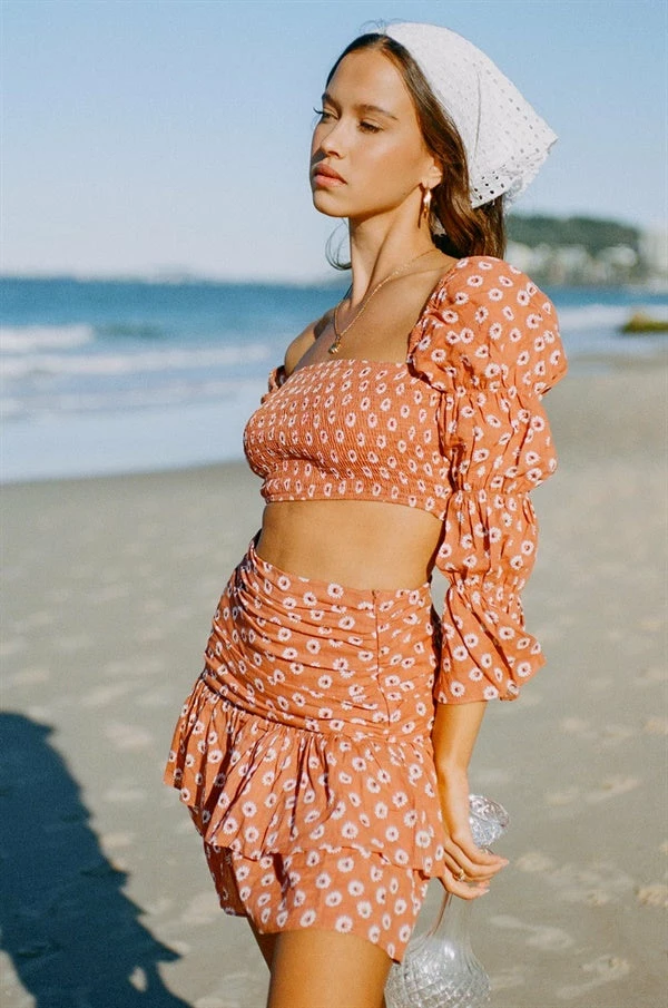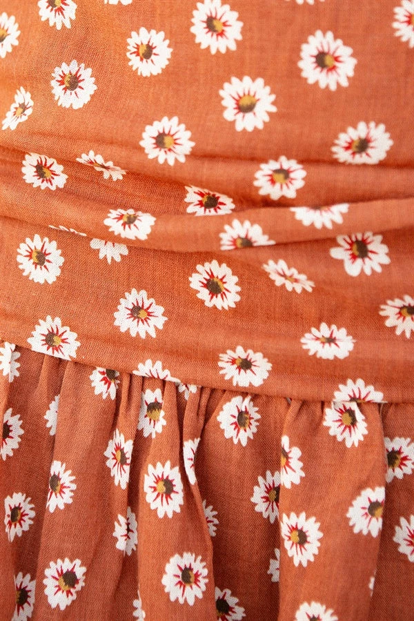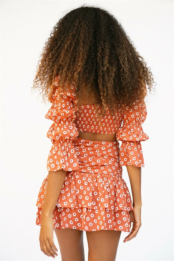 *THIS IS A FINAL SALE ITEM* Feminine florals and accentuated sleeves! The Emory Top is made from a natural cotton fabric in a burnt orange hue. It is a cropped style featuring a straight neckline, shirred bust and panelled puff detailing at sleeves! Exclusively designed by Sabo.