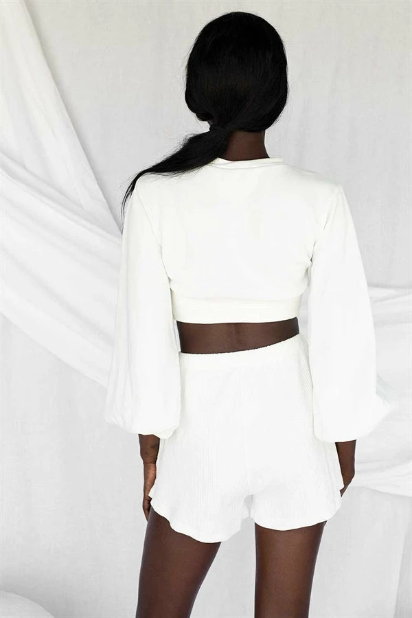 *THIS IS A FINAL SALE ITEM* A staple basic that can be worn as a set or styled your way! The Esma Shorts are a high waisted style made from a ribbed fabric in a light cream hue featuring an elasticated waist with drawstring, pockets and high-low hems. Pair with the Esma Top and Statement Link Bracelet! Exclusively designed by Sabo.