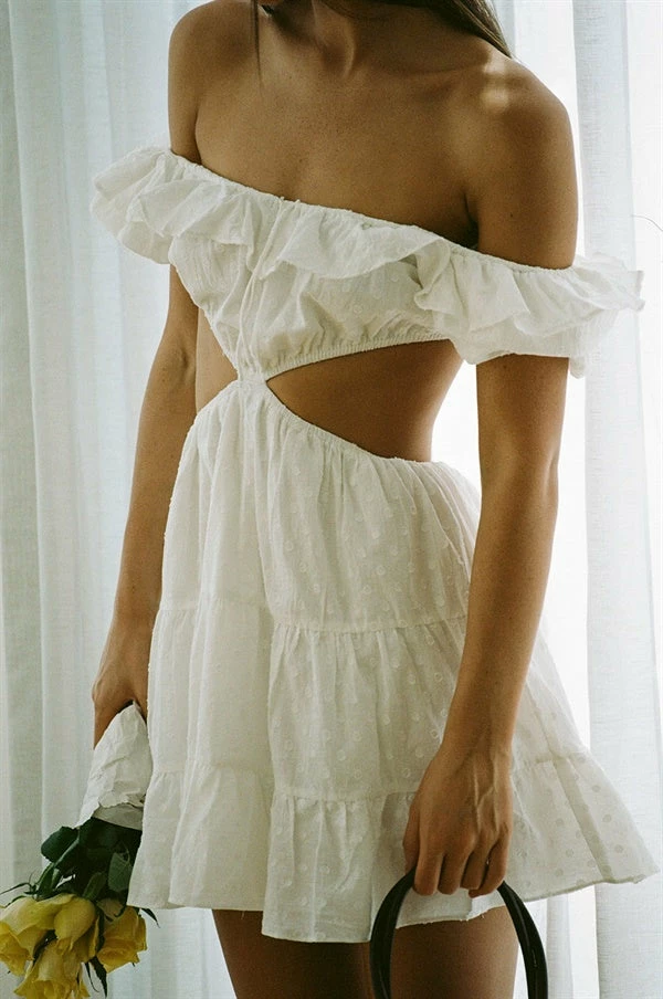 Designed to flatter! The Eva Frill Dress is made from a natural dobby spot cotton fabric in white. It is an off shoulder style featuring a frill across shoulders, short puff sleeves, cutouts at waist and a flouncy triple tiered skirt. Style your look with the Strappy Ares Heels and Kumi Bag! Designed exclusively by Sabo.