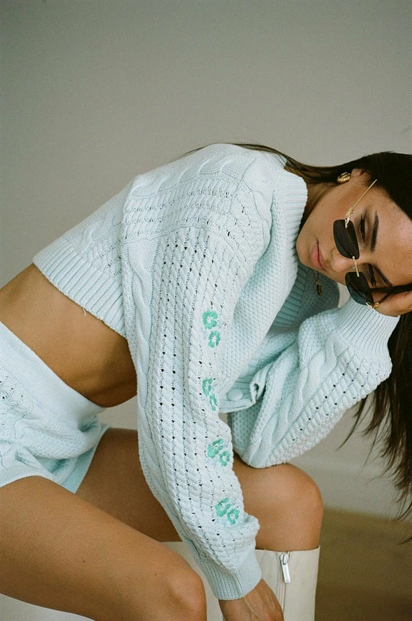 The cutest outfit to transition into the cooler months! The Gabbi Knit Cardi is made from a soft cotton blend knit in a pastel blue hue. It is a cropped style featuring a V neckline with buttons down centre front, cable design at sides and sleeves and embroidered floral detailing at sleeves. Get the look with the Gabbi Knit Shorts! Designed exclusively by Sabo.