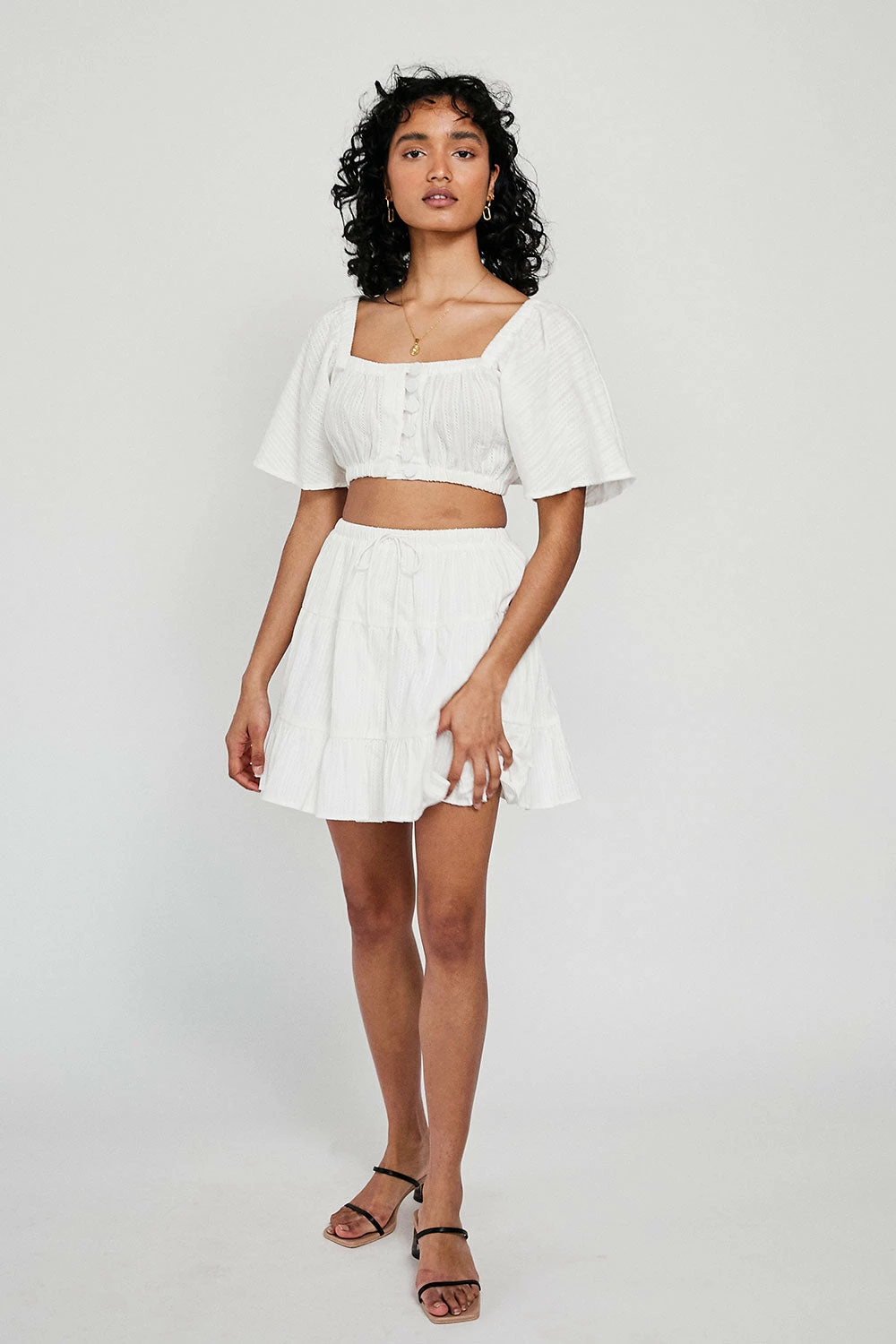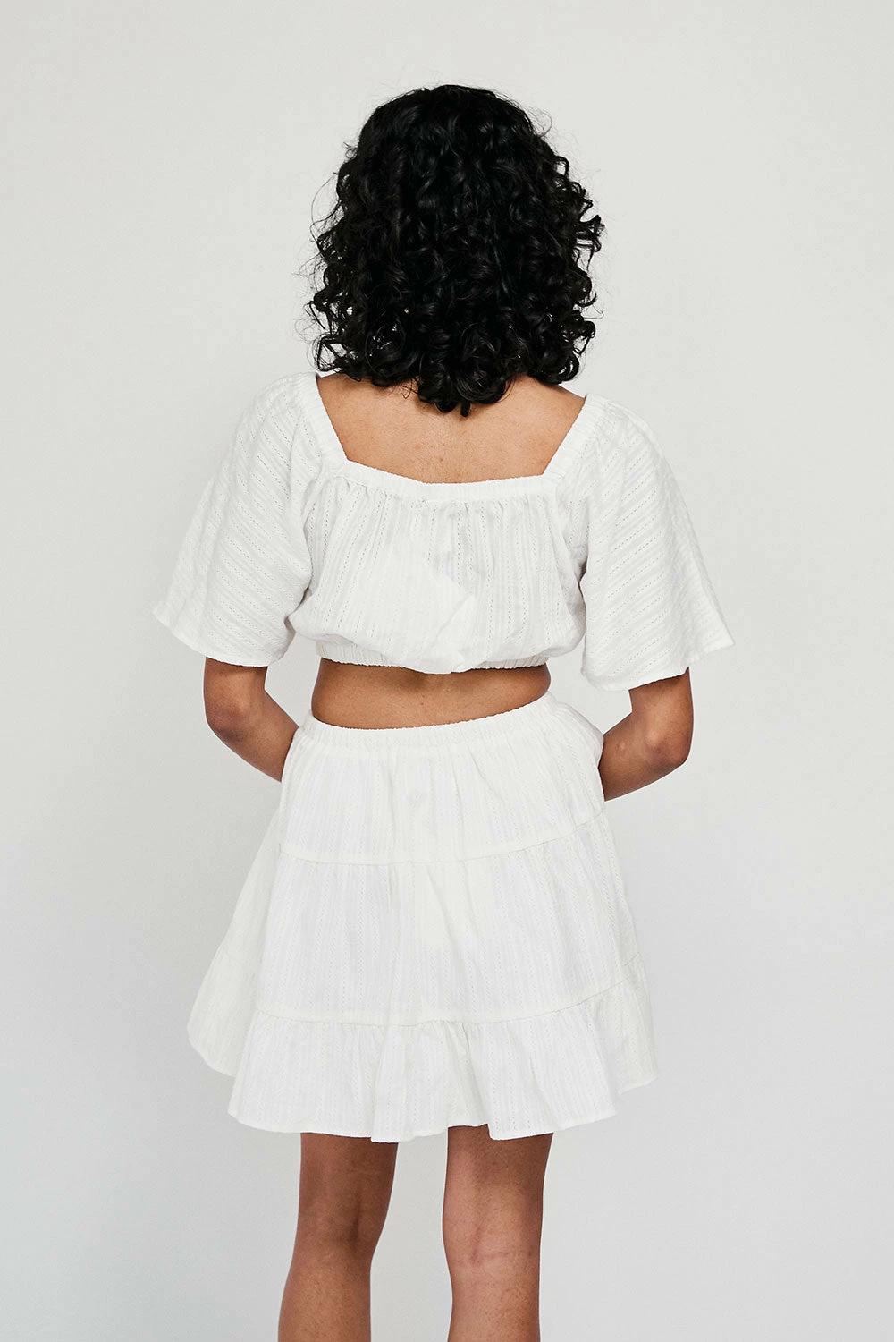 The sweetest set in a luscious fabric! The Gabriella Skirt is made from a high quality natural vertical dobby cotton in white. It is a high waisted style featuring an elasticated waist with draw tie and a flouncy triple tiered skirt and stunning textured self stripes throughout. Get the set with the Gabriella Top! Designed exclusively by Sabo.