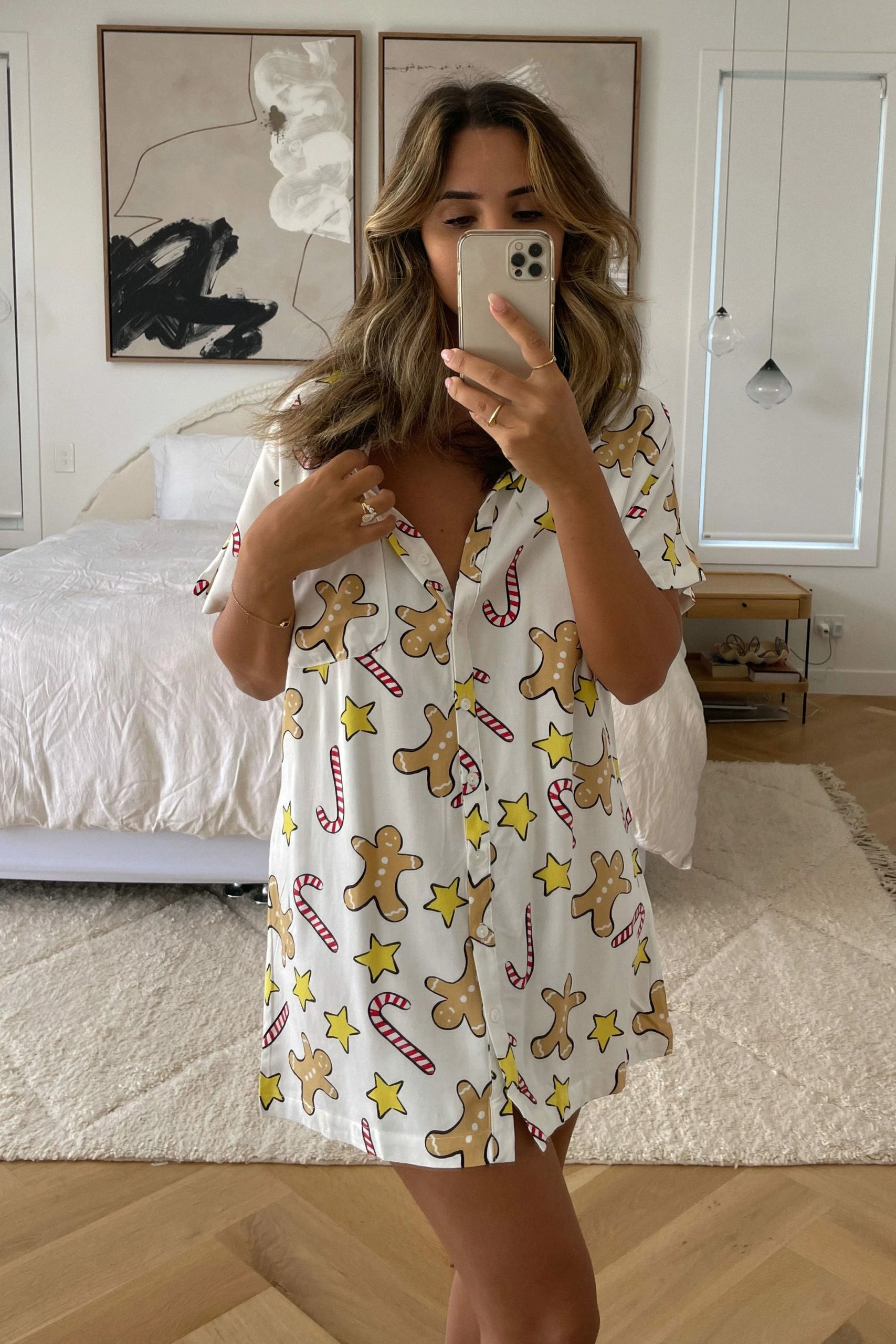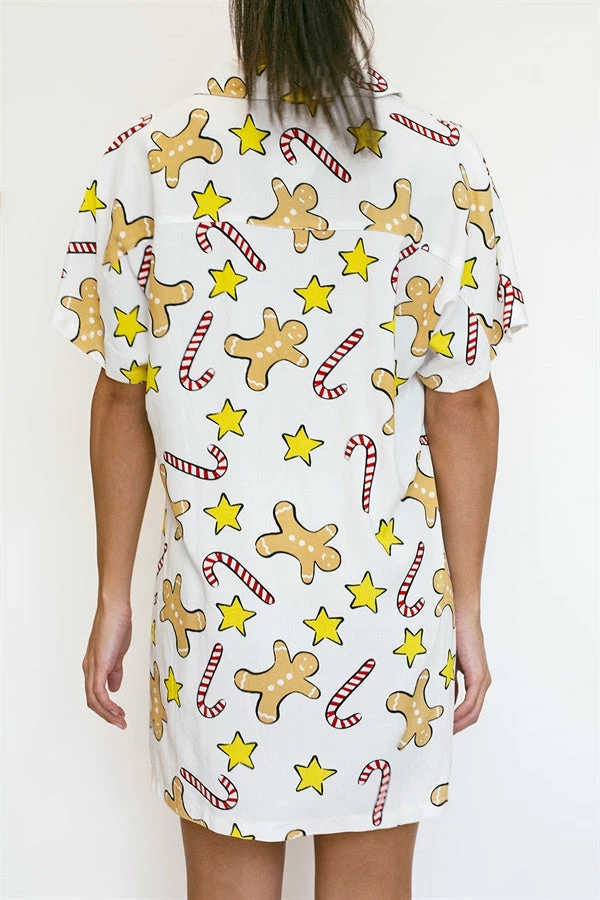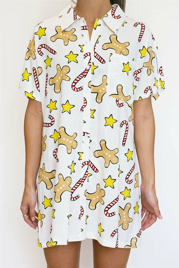 It’s Christmas Time! T Gingerbread Dress is made from a lightweight fabric with our custom Gingerbread print. It is a relaxed style featuring short sleeves with rolled detailing, collar, left breast pocket and faux tortoise buttons. By Sabo Sleep.